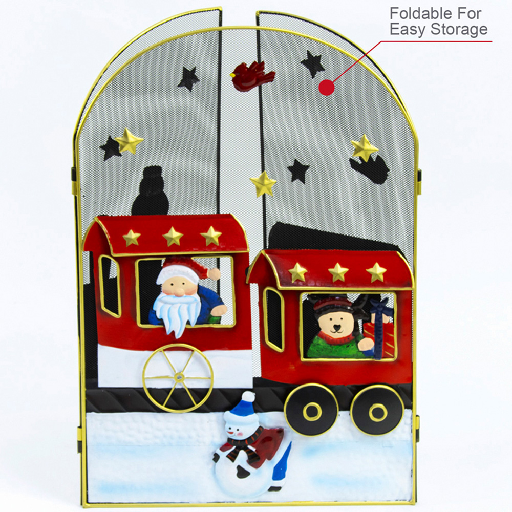 This Christmas Workshop Santa and Snowman Train fire guard adds festive sparkle to your home. A charming decorative addition, its festive scene creates a customizable landscape perfect for the holiday season. Measuring 91 x 63cm, this metal fire guard features a mesh finish and makes a stunning focal point in your living room. The hinged side panels adjust to fit your fireplace perfectly. Beyond the fireplace, it also protects your Christmas tree from curious children and pets. Note: For decorative purposes only, not suitable for use with a lit fire.