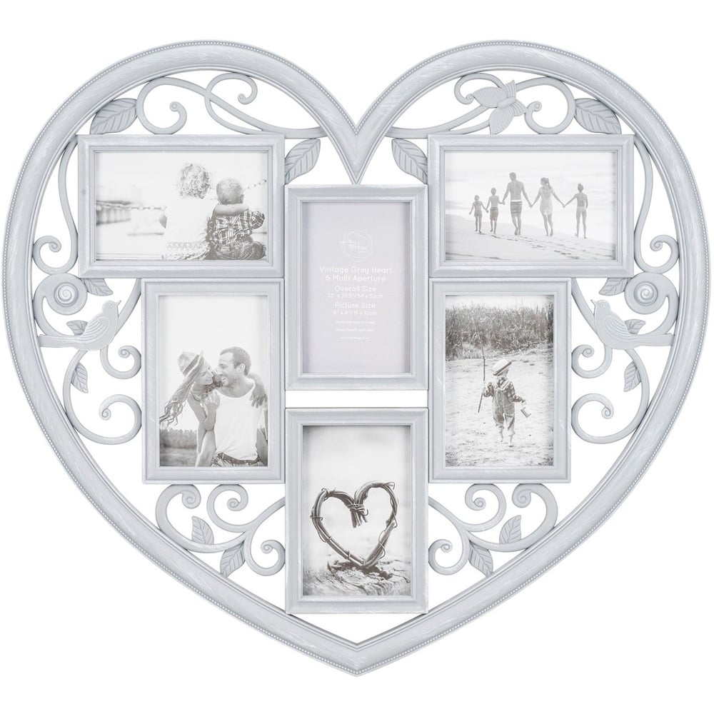 A charming shabby chic frame, perfect for showcasing six cherished photos. This Vintage Grey Heart Multi Aperture Frame boasts intricate fretwork of curling vines, birds, and butterflies, all finished in a distressed grey with classic bead detailing. Its heart shape adds a touch of romance to any wall display.