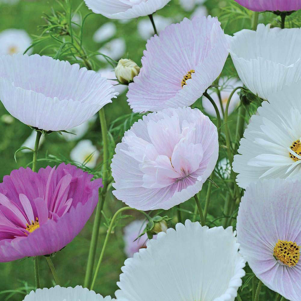 Cosmos Bipinnatus Cupcakes: A delightful mix of elegant white, pale pink, and rose pink single and semi-double blooms in a charming cup shape. These free-flowering, easy-to-grow cosmos are perfect for adding a touch of elegance to borders or brightening up containers. Thriving in full sun, these half-hardy plants reach up to 120cm tall and spread up to 60cm wide. Ideal for patios, cottage gardens, wildlife gardens, and cut flower displays. Each packet contains 100 seeds. Sow from March to May, 3mm deep in seed compost, covering lightly with vermiculite. Maintain damp soil and provide warmth (18-25°C) for germination (7-15 days). Transplant seedlings into 7cm pots, then acclimatise outdoors before planting 45cm apart in moist, well-drained soil. Pinch out growing tips to encourage branching. Images are for guidance only; results may vary.