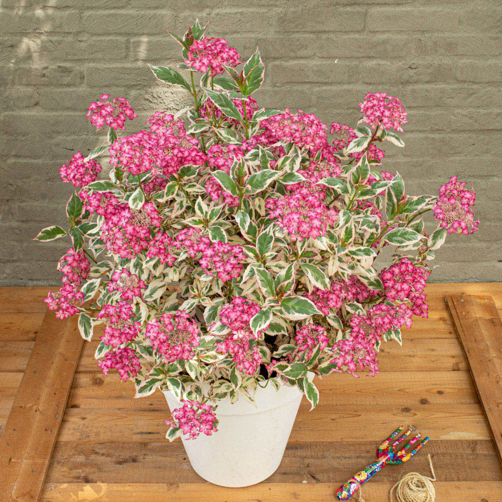 Behold 'Euphoria Pink', a botanical marvel and runner-up in the RHS Chelsea Plant of the Year 2023 competition. This remarkable hydrangea boasts a unique combination of tricolour foliage and captivating two-toned pink flowers. The silvery green foliage, edged with a crisp white margin and delicate pink tints in spring, provides a stunning backdrop to the summer blooms.