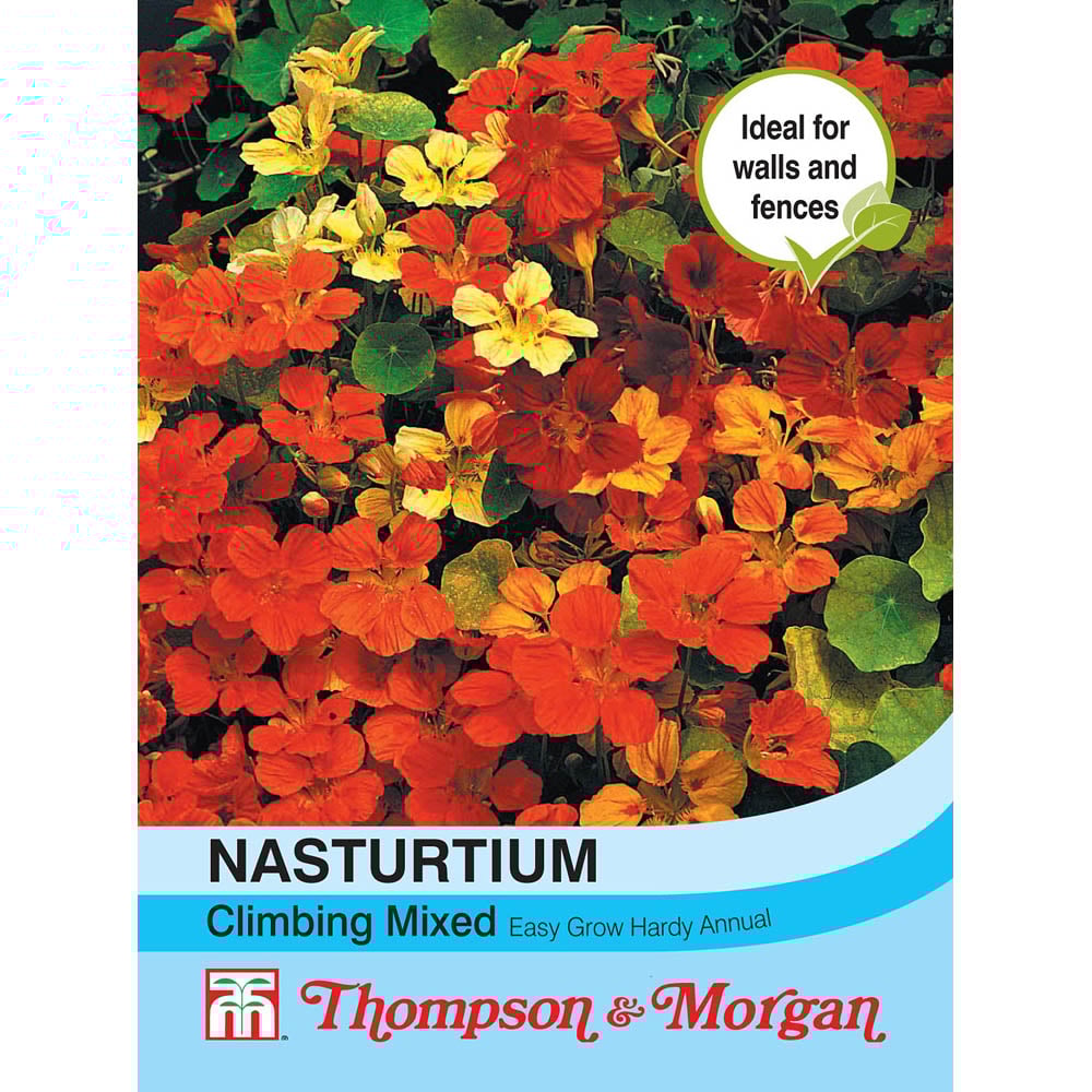 Add vibrant summer colour to your garden with Nasturtium Climbing Mixed. This vigorous climber quickly establishes itself, ideal for draping over walls, fences, trellises, or obelisks. Expect a profusion of frilly blooms in a dazzling array of colours, including bicolour varieties, throughout the summer months. The peppery leaves and colourful flowers add a delicious zing to salads, while the unripe seeds, used like capers, are a tasty addition to canapés – try them with cream cheese or butter. Sow directly outdoors where the plants will flower, preparing the ground by raking it fine and crumbly, removing any stones. Sow seeds 20mm deep, in rows 30cm apart. Thin seedlings to 23cm apart once established, watering regularly until they are well-rooted. For earlier blooms, sow seeds in 7.5cm pots of free-draining compost at 15-20°C until germination, gradually acclimatising to outdoor conditions before planting out after the last frost. Mature plants reach up to 240cm high and 150cm across. Supplied as a single seed packet. Images are for guidance only; results may vary depending on growing conditions.