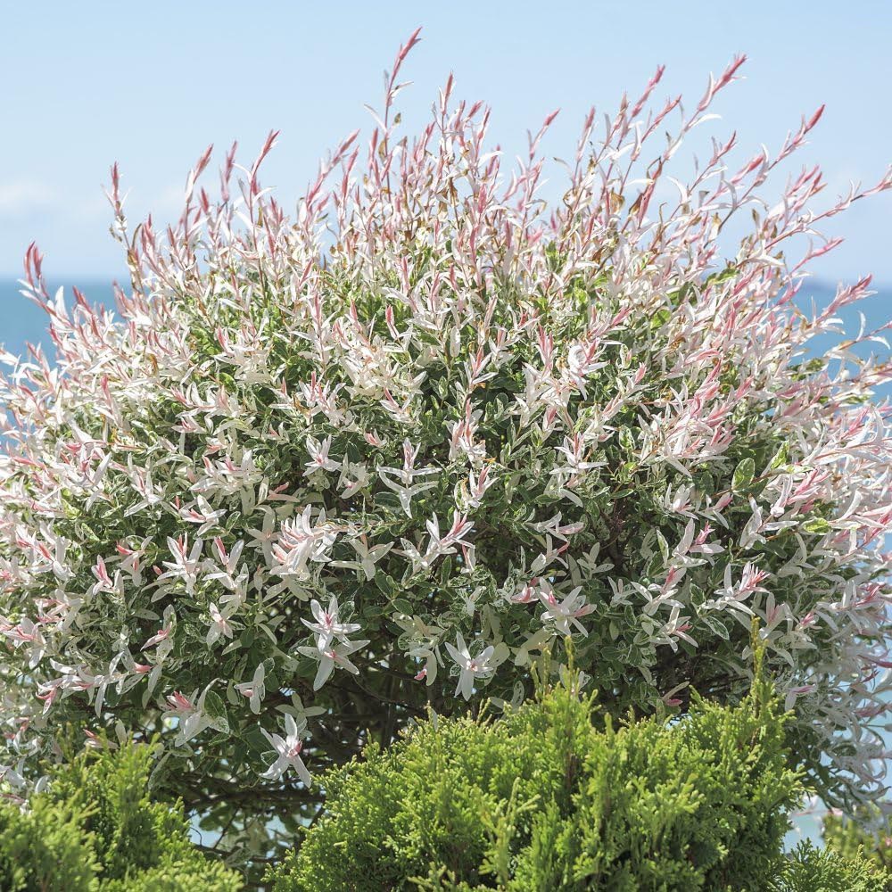 Discover the captivating beauty of the Salix 'Hakuro-Nishiki', more commonly known as the Flamingo Tree, a Willow celebrated throughout the UK for its colourful foliage. Throughout the seasons, its leaves present a stunning display of marbled pink, green, and white, which gives way to vibrant orange stems in the autumn. The Flamingo Tree is a celebration of the seasons, not just about looks.