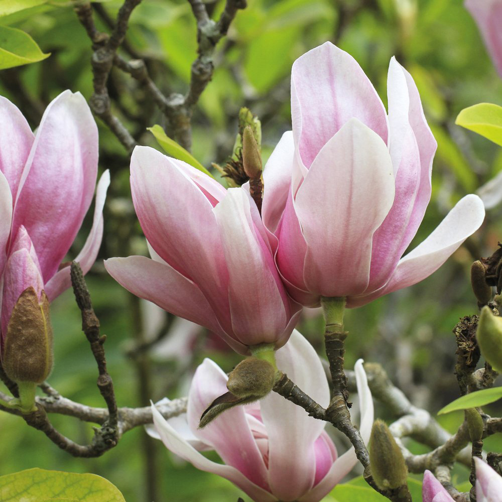 Magnolia Red Lucky delivers a spectacular spring show with pale pink, goblet-shaped flowers, each petal flushed with deep rose on the outside. Appearing on bare branches before the handsome green foliage, these blooms create stunning focal points, flowering twice, in spring and late summer. This low-maintenance, deciduous magnolia is perfect for growing in a large container on the patio or decorative borders. Plant in a sunny or semi-shaded position, sheltered from cold winds and hard spring frosts. It thrives in rich, moist, well-drained, acid to neutral soil enriched with plenty of well-rotted manure or garden compost before planting. Shading the roots encourages quicker establishment, and mulching around the base is beneficial. Water during the growing season until established; little to no pruning is needed.