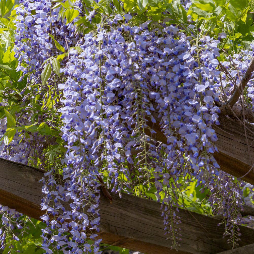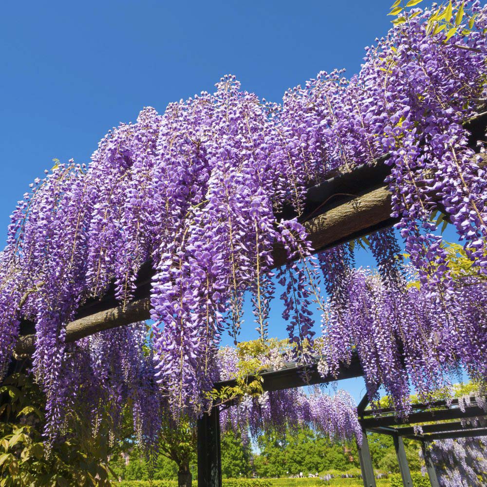 Create a breathtaking display with our Wisteria Sinensis, boasting lilac-blue pendants and a captivating fragrance that will attract bees and other pollinators. This vigorous climber, reaching up to 9m high and 5m across, thrives on trellises, fences, or walls. Perfect for patios, walls, fences, cottage gardens, scented gardens, or as a stunning specimen plant. It flourishes in sunny or semi-shaded spots with moist, well-drained soil. A sheltered position is recommended to protect delicate flower buds from late frosts. Enrich the soil with well-rotted manure or compost before planting and provide sturdy support, such as a trellis or strong wires. Supplied as a single plant in a 9cm pot. Note that images depict mature plants; actual plant size and appearance may vary with growing conditions and season.