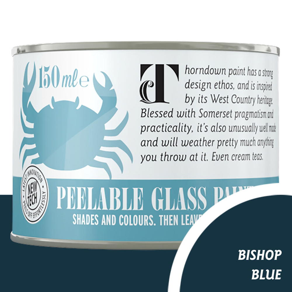 Transform any glass or shiny surface with Thorndown Bishop Blue Peelable Glass Paint. This dark blue opaque paint is water-based, made from resin using 100% recycled plastics, and is perfect for adding shade, privacy, or temporary decorations. Peelable for easy removal, it's ideal for seasonal events like Christmas and Halloween, parties, or permanent craft projects on tiles, mirrors, shower screens and more. Suitable for glass, polycarbonate and acrylic glazing, this versatile paint offers a durable, water-repellent finish, whether brushed, rolled, sprayed, or mixed. Non-toxic, virtually VOC-free (0.05%), and halogen-free, it has a low carbon footprint and covers 12 square meters per litre, for indoor or outdoor use. 150ml.