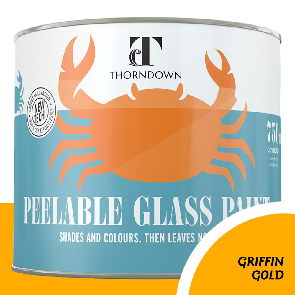 Transform your glass with Thorndown's Griffin Gold Peelable Glass Paint. This versatile, translucent paint in a bright, soft golden orange or yellow shade lets you create stunning stained-glass effects or add practical shading to any glossy surface. Ideal for temporary decorations—perfect for holidays and parties—it's also suitable for permanent projects on tiles, mirrors, and shower screens. Easily peelable when you're ready for a change. Made from resin using 100% recycled plastics, it's non-toxic, virtually VOC-free, and boasts a low carbon footprint. Offering durable, water-repellent coverage of 12 square metres per litre, it's suitable for indoor and outdoor use. Brush, roll, spray, or mix colours—the possibilities are endless. It even adheres to polycarbonate and acrylic glazing. Eco-friendly and sustainable, old coatings can be returned to Thorndown for recycling. Halogen-free. 750ml.