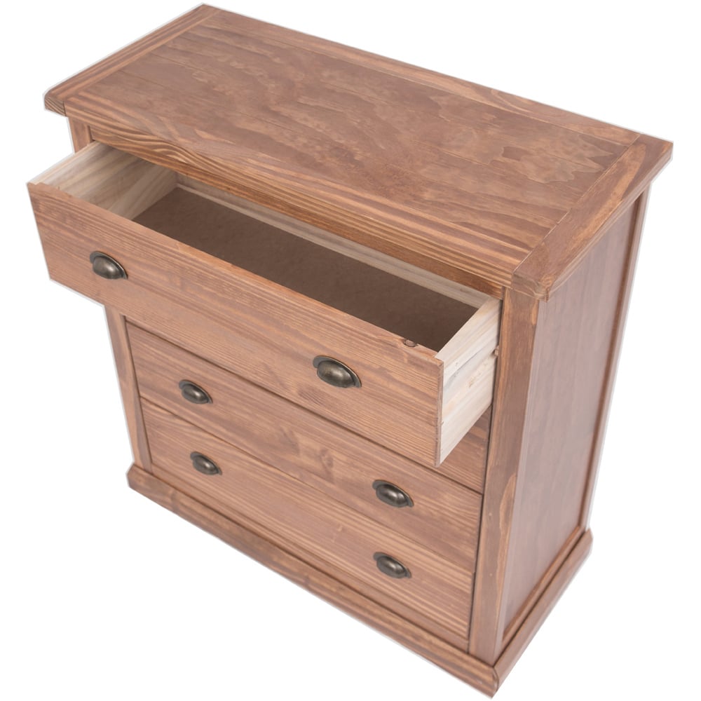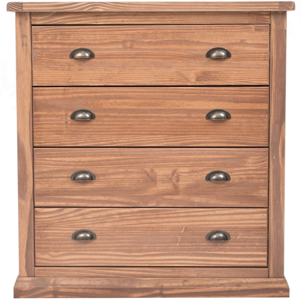 Bring a touch of rustic charm to your home with the Tirolo 4-Drawer Light Brown Chest, complete with brass cup handles. The robust top provides a perfect platform for displaying a favourite clock or ornament. Featuring four drawers, each adorned with brass cup handles, this chest offers ample storage space for all your essentials.