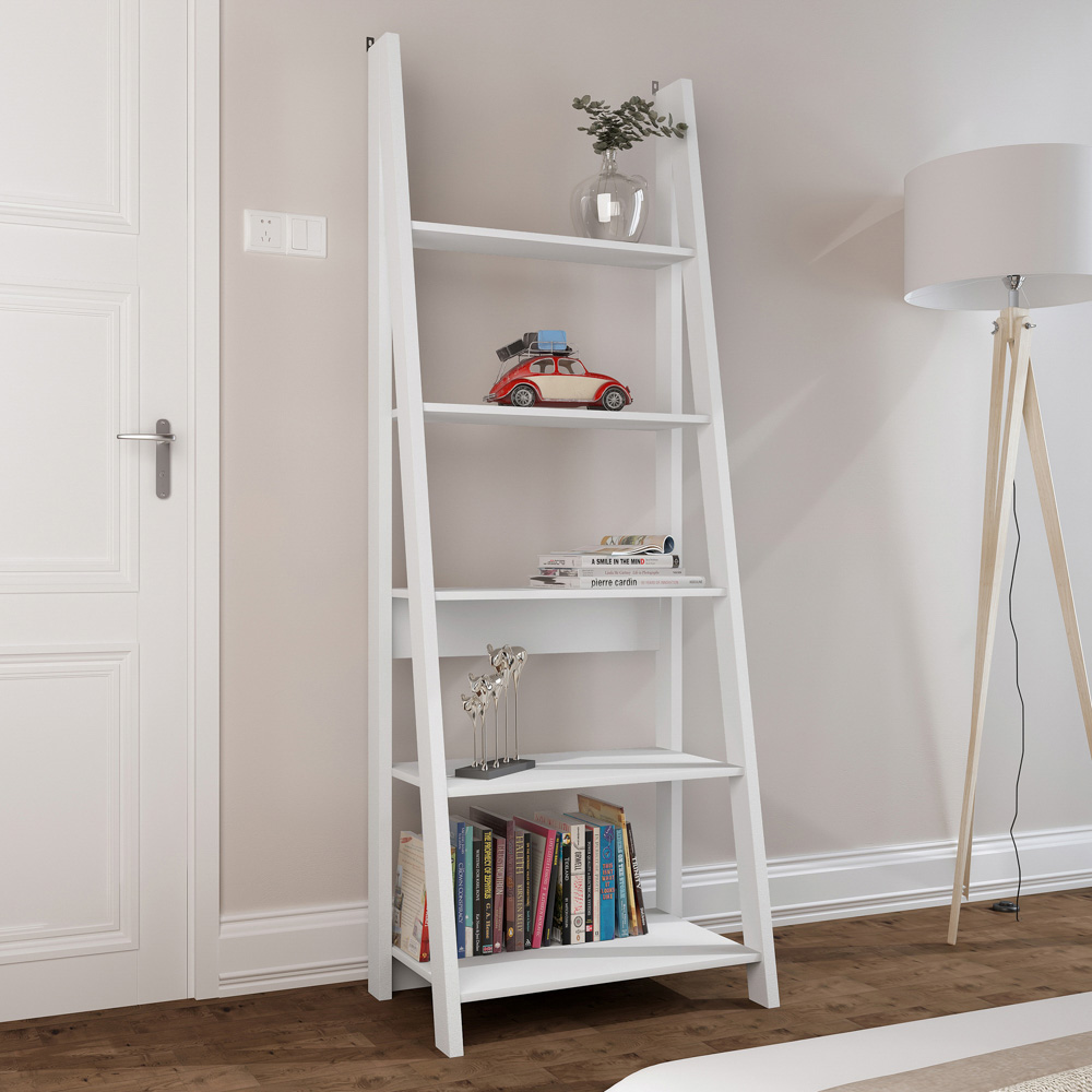 The latest trend of ladder-style storage hasn't been overlooked with the Tiva 5 Shelf Ladder Bookcase. Comprising beautiful, leaning lines and simple shelving structures, this unit is finished in a stunning white. Including five well-spaced shelves, this ladder-style bookcase is ideal for creating simple shelving or display areas around the home, whatever your style! A chic storage solution that captures the essence of modern simplicity and functionality, the Tiva bookcase offers an aesthetically pleasing and practical way to display books, décor, or media. Its ladder-style design ensures it fits seamlessly into small or large spaces alike, making it both a statement piece and a versatile storage option.