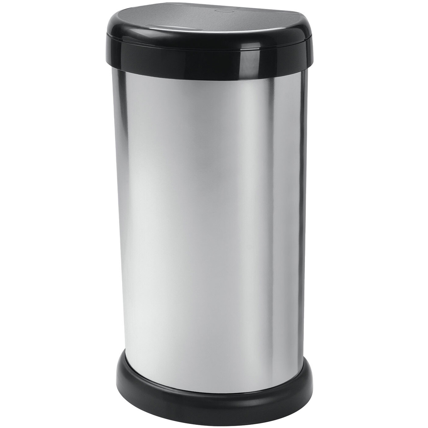 A stylish, curved bin in silver, designed for effortless integration into any kitchen. Its flat back ensures a neat fit against the wall, while the push-open lid and integrated bin liner retaining ring offer quick and convenient waste disposal. A truly elegant addition to your home.