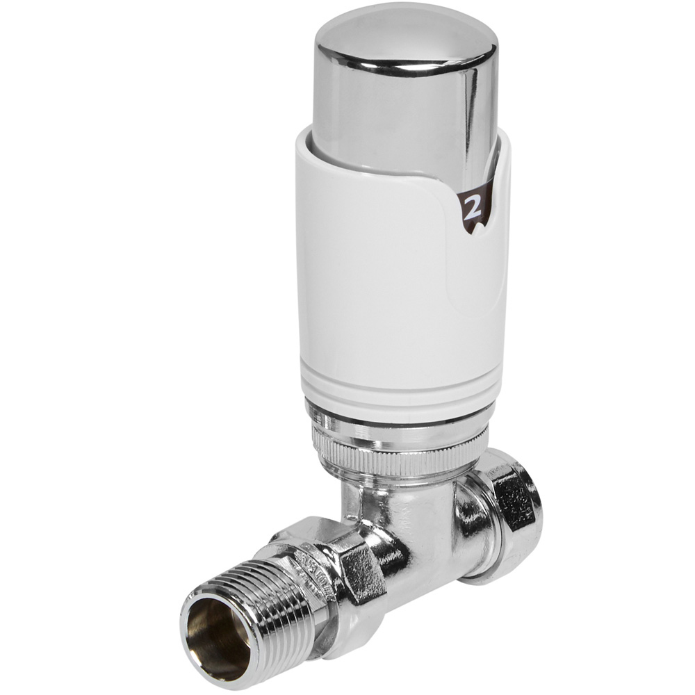 White Straight TRV and Lockshield Set 15mm x 1/2in. Precisely control your radiator's heat output for energy savings and optimal comfort. Six temperature settings (7-29 degrees). Features a liquid sensor for efficient heating regulation.
