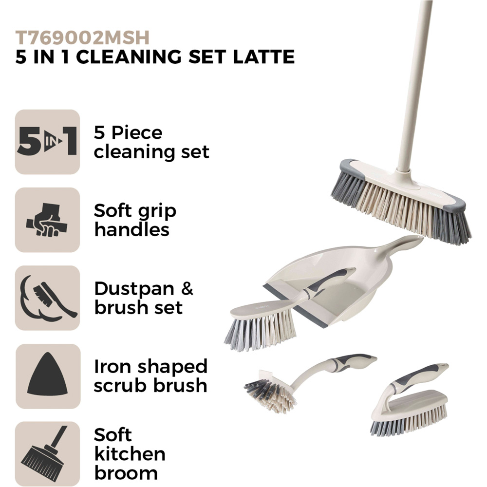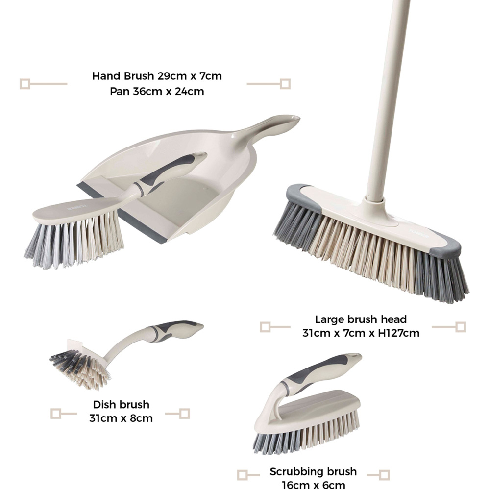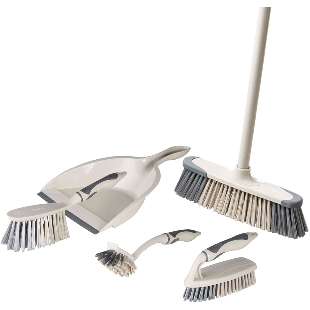 The Tower 5-in-1 Kitchen Cleaning Set makes light work of kitchen cleaning. This comprehensive set includes a soft broom for gentle sweeping, a dustpan and brush for efficient dirt collection, a dish brush perfect for hard-to-reach spots, and a powerful iron-shaped scrub brush for tackling stubborn stains. Every brush features an ergonomically designed soft-touch handle for comfortable and easy cleaning. The set comes with a one-year warranty, extendable to three years upon online registration.