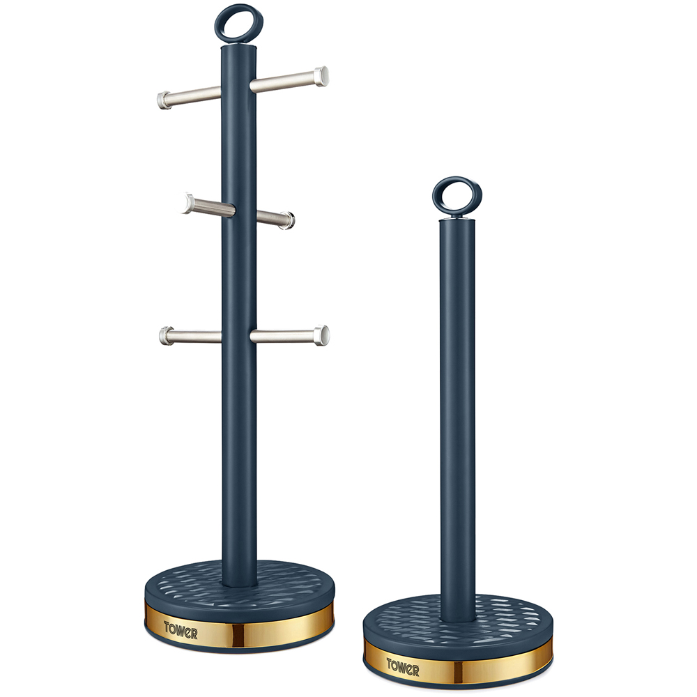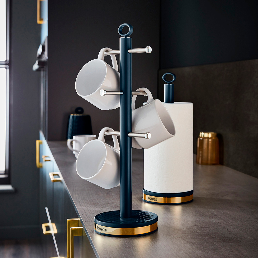 This stylish kitchen organiser keeps your favourite mugs readily accessible. A midnight blue body, accented with a striking V-shaped pattern, stainless steel branches, and bronze bases, creates an elegant look. Six mugs of varying sizes are securely held by cleverly designed branches with handy stoppers. Anti-slip bases provide countertop stability, and the easy-wipe design simplifies cleaning. This on-trend mug tree and towel pole set is part of the Empire range, which also includes a bread bin.