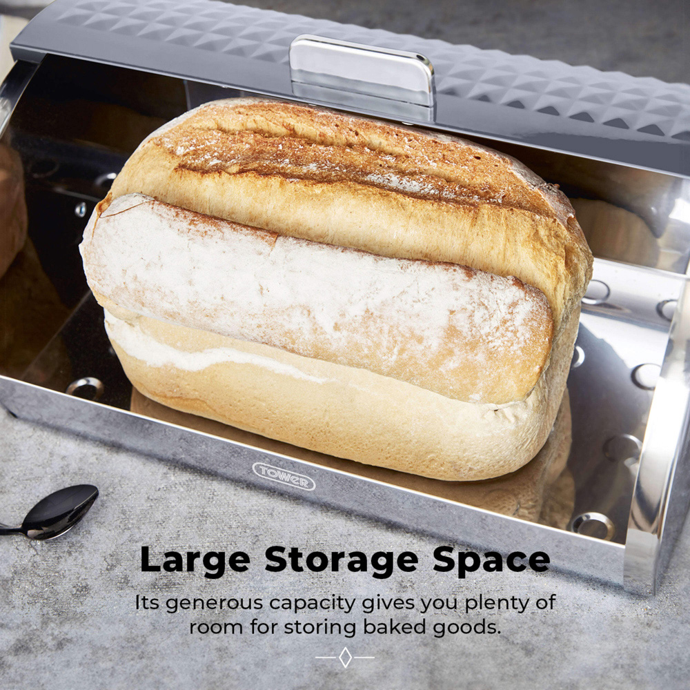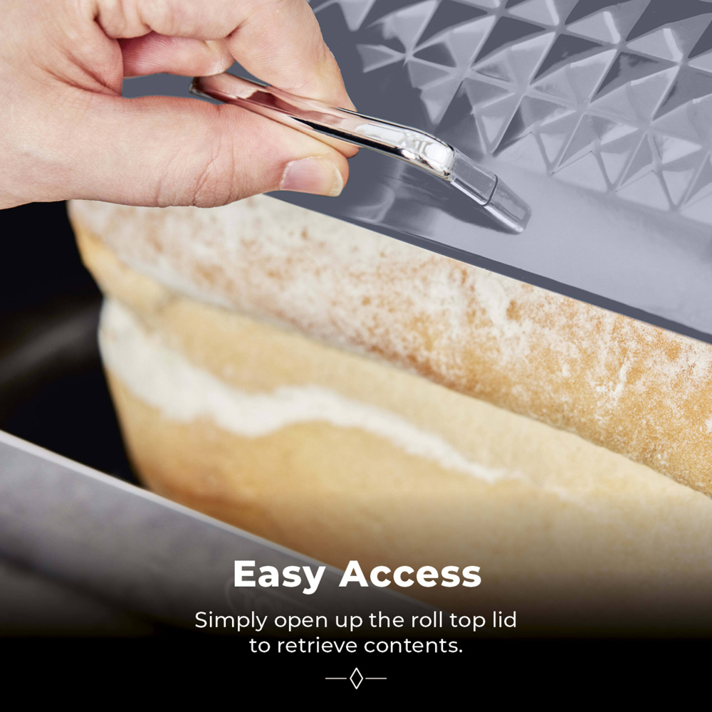 Elevate your kitchen counter with this stylish bread bin. Its sleek grey stainless steel design adds a contemporary touch, while the built-in ventilation system keeps your bread, crumpets, and bagels fresher for longer. The generous interior easily accommodates loaves and rolls of various sizes. A convenient roll-top lid and bar handle provide effortless access, and the durable stainless steel requires only a quick wipe to maintain its pristine finish.