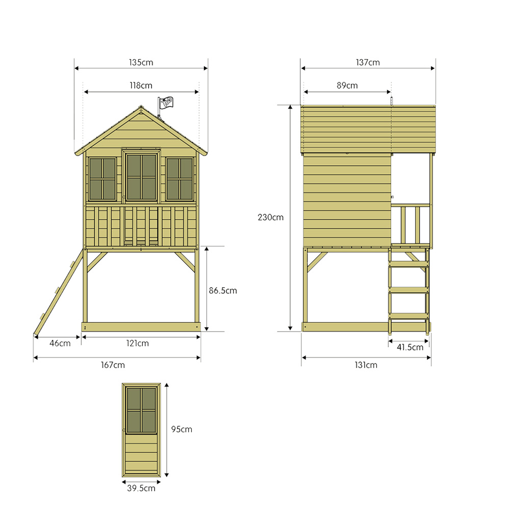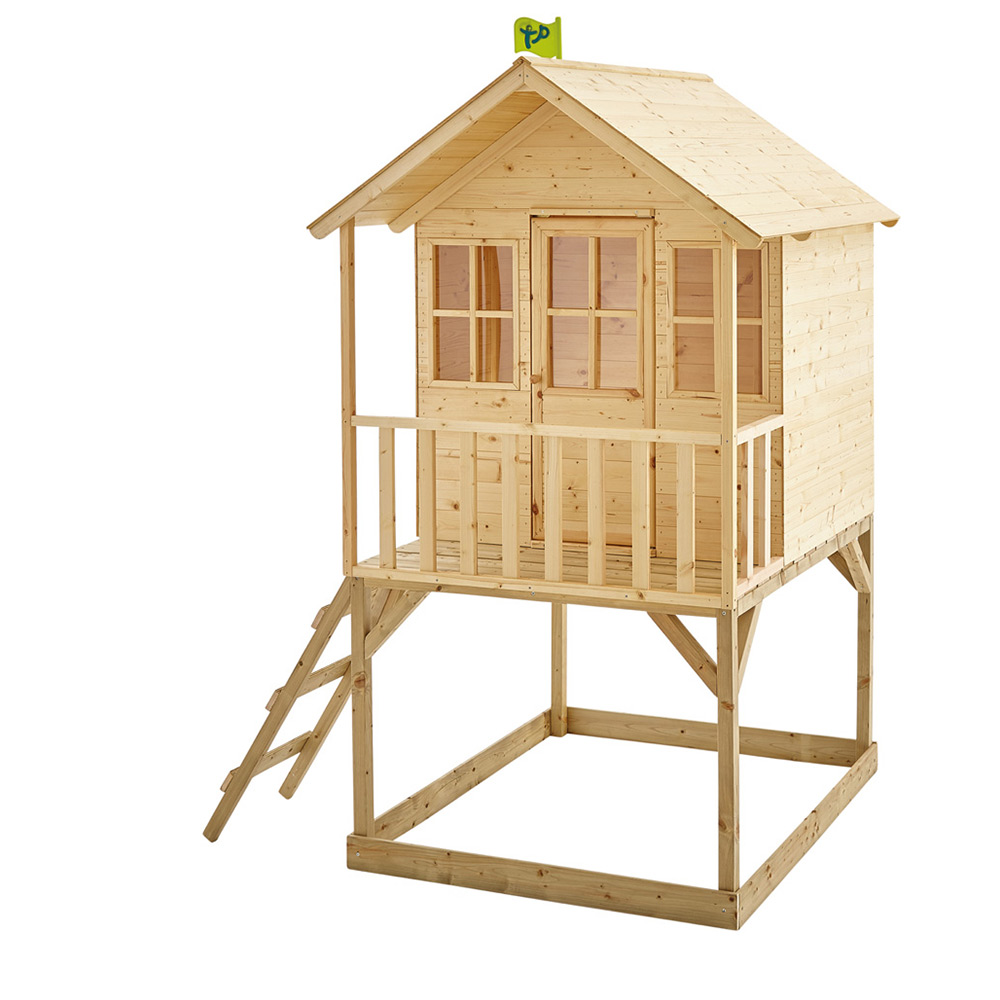 The Hilltop Wooden Tower Playhouse is a charming, sturdy playhouse crafted from easy-to-assemble treated wood panels. Two windows and a door add to its appeal, while a ladder provides access to the raised platform. This creates a shaded area ideal for a sandpit, perfect for sunny gardens and extra playtime fun.