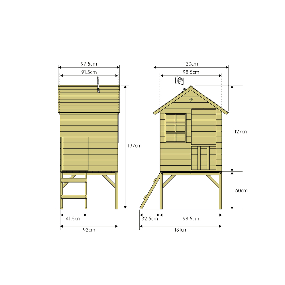 This adorable wooden playhouse is perfect for children aged 18 months and older. Crafted from easy-to-assemble wood panels, it features a fun crawl-through side entry door and a sturdy wooden ladder leading to a raised platform. Hours of imaginative play await.