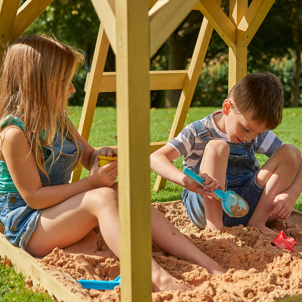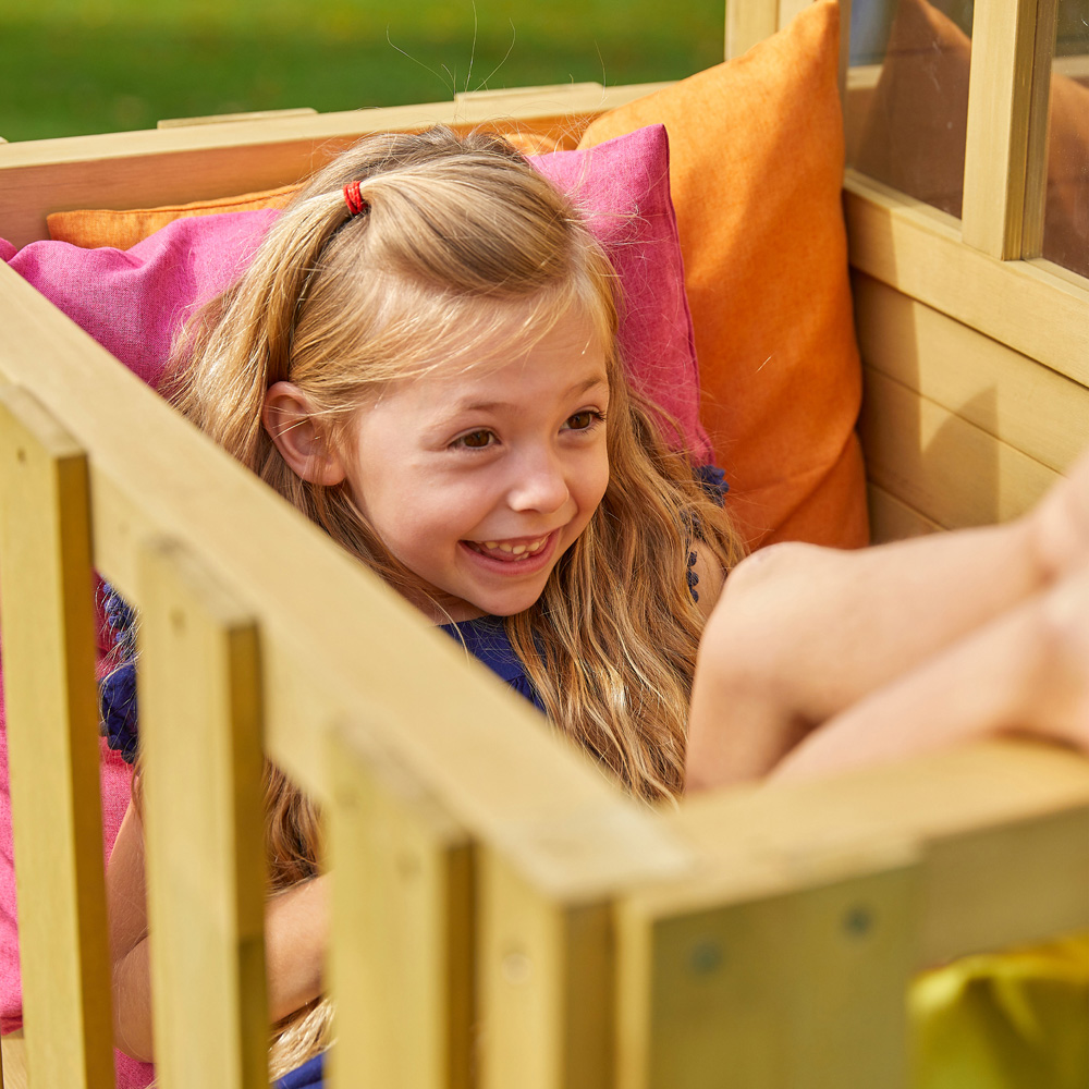 The TP Treehouse Wooden Playhouse is the ultimate outdoor retreat for young explorers, promising countless hours of joyful play and guaranteed to put smiles on your children’s faces for years to come. Designed with a charming balcony, it offers a perfect spot for children to unwind on sunny days or embark on exciting adventures. The playhouse features a swing arm and slide for even more fun, enhancing the play factor and encourageing active play. For an added touch of creativity, you can attach the panel kit, allowing for a personalised touch to your little one’s new favourite outdoor space. Built to last and provide enduring smiles, this playhouse is sure to be a cherished addition to your garden.