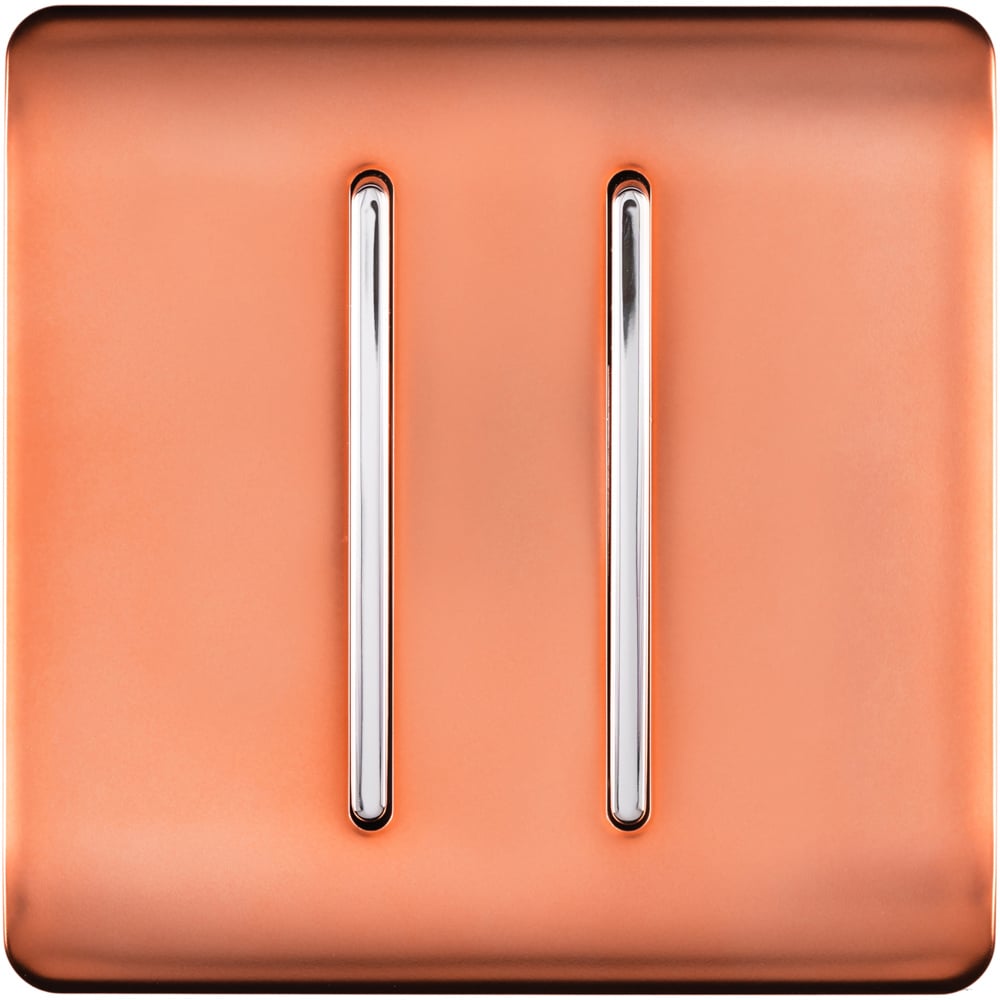 Upgrade your home',s lighting with the 2-gang 10amp 1 or 2-way copper rocker light switch from the Trendi Switch range. This stylish switch boasts a sleek, modern design crafted from durable, fireproof ABS plastic. Its screwless faceplate showcases the full copper colour, creating a seamless, polished look perfect for contemporary interiors. The cleverly designed back frame ensures compatibility with standard back boxes and wiring systems, making installation a breeze – simply replace your old switch by removing the faceplate and clicking the new one in. No extra wiring is needed! The matt black surface of the faceplate is easy to clean and retains its elegant appearance, even in direct sunlight.