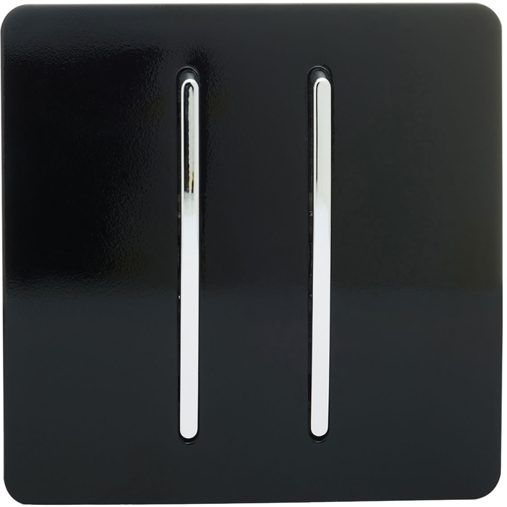 Upgrade your home',s aesthetic with this 2-gang, 10-amp, 1 or 2-way piano black rocker light switch from the Trendi Switch range. Its sleek, modern design is crafted from high-quality, fire-resistant ABS plastic for lasting durability. The screwless faceplate showcases the rich black finish flawlessly, creating a seamless, polished look perfect for contemporary interiors. Designed for easy installation, it seamlessly replaces your existing switch without extra wiring – simply remove the old faceplate and click this one into place. The matt black surface is easy to clean and retains its elegant appearance, even in direct sunlight. The back frame, with its concealed screw holes and module, ensures compatibility with standard back boxes and wiring systems.