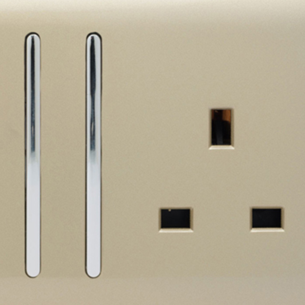Introducing the Trendi Switch 2 Gang Long Switched Plug Socket in Champagne Gold—a sophisticated enhancement for any modern space. This set of seven boasts a screwless front plate, ensuring a streamlined appearance and straightforward installation. Finished in a luxurious champagne gold with a sleek, high-gloss surface, these sockets maintain their rich colour even when exposed to sunlight. Each socket features a designer chrome rocker switch, adding a contemporary touch while providing effortless operation. Constructed from premium, fireproof ABS plastic, these durable sockets offer both style and safety for your home or office.