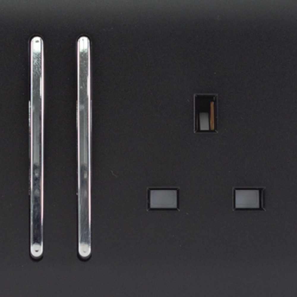 Part of the full Trendi Switch range, this pack of seven Trendi Switch 2 Gang Long Switched Plug Sockets comes in a matt black finish. Operated by a sleek chrome rocker switch, this socket not only looks good but is also nice and easy to locate and flick on and off. The screwless design complements any modern décor, and installation is a breeze, requiring no additional wiring. Constructed from high-quality fireproof ABS plastic, these sockets ensure durability and safety, making them ideal for bulk purchase and seamlessly blending functionality with a stylish appearance in any home or office.