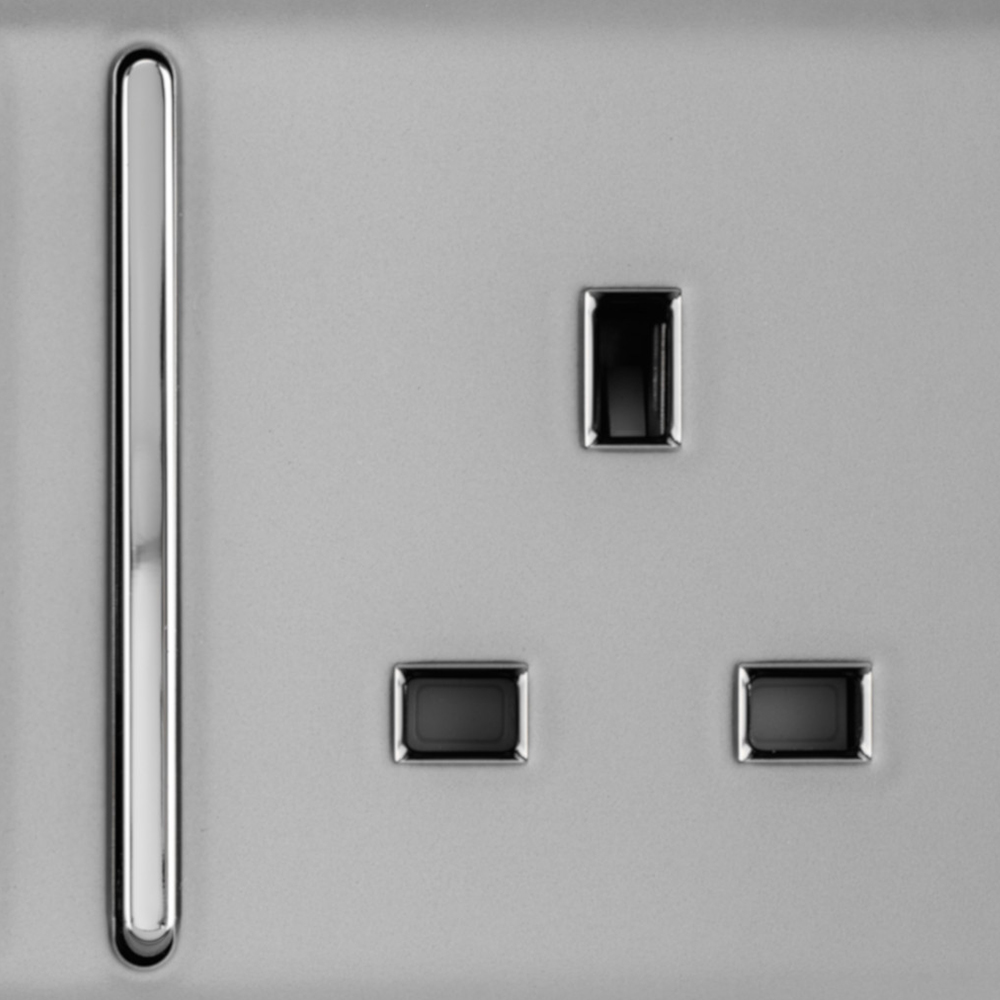 Enhance your home with the Trendi Switch 2-gang, 13amp brushed steel switched plug socket. This stylish addition boasts a sleek, screwless design and a chrome rocker switch for effortless operation. The high-quality, fire-resistant ABS plastic construction, finished in a sophisticated brushed steel, ensures both durability and a modern aesthetic. Its matte black polished surface resists fading, maintaining its elegant look for years to come. Simple to install – just remove your old switch and click the new faceplate into place – this 13amp socket is perfect for contemporary interiors.