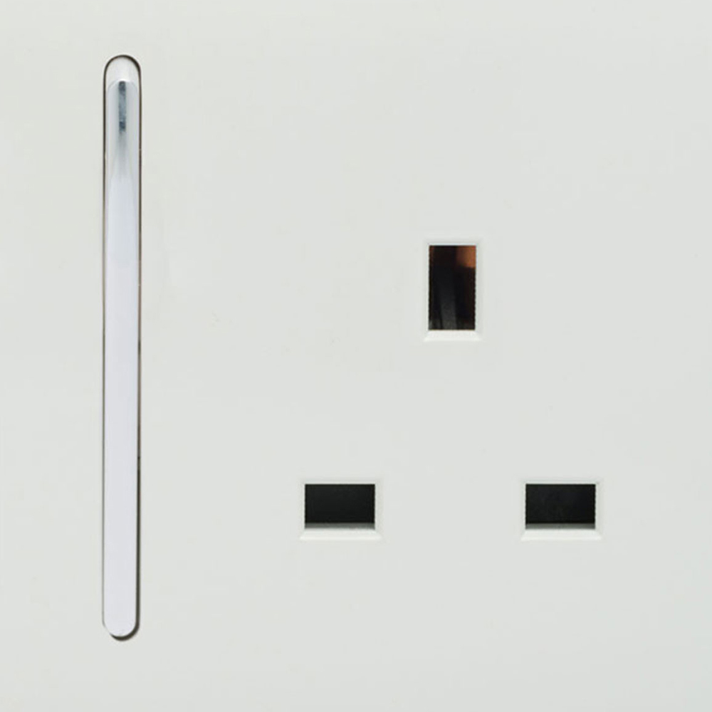 Elevate your interior with the Trendi Switch 2-gang 13amp socket. This stylish addition boasts a sleek, screwless design in ice white, complemented by a polished chrome rocker switch. Made from high-quality, fire-retardant ABS plastic, its matte finish ensures enduring elegance and sun-resistance. Simple to install, just swap out your old socket – a quick click and you',re done. Perfect for contemporary homes, this socket delivers reliable 13amp power.