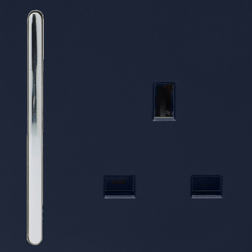 Elevate your interior with the Trendi Switch 2-gang 13amp socket in stylish navy blue. This sleek addition to the Trendi Switch range boasts a screwless design and a sophisticated chrome rocker switch, perfectly positioned for effortless operation. Crafted from high-quality, fire-resistant ABS plastic, its matte finish ensures enduring elegance and resistance to sun damage. Simple to install – just click the new faceplate in place of your old one – this 13amp socket is the perfect complement to any modern home.