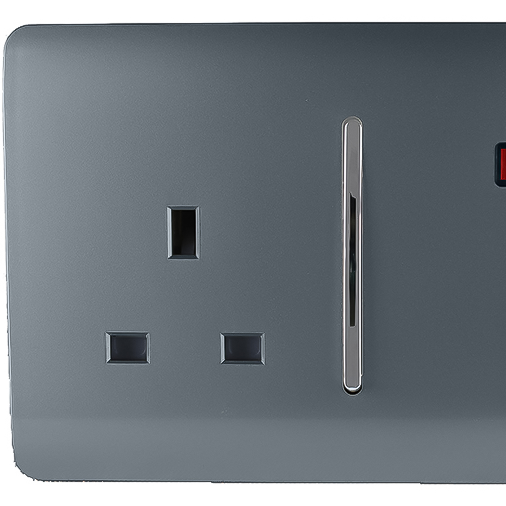 Enhance your home',s aesthetic with the Trendi Switch 45 amp and 13 amp cooker switch and plug socket in a sophisticated warm grey finish. This stylish addition boasts a fireproof ABS plastic construction for both safety and a contemporary look. The screwless plate, complete with chrome rocker switches and a plug socket, is effortlessly installed thanks to its back frame and convenient screw holes. No extra wiring is required, simplifying cleaning and upkeep. The smooth, polished faceplate is resistant to fading, even in direct sunlight. Upgrading is a breeze – simply remove your old switch and click this one into place. Please note: this double-sized plate accommodates 6mm cables and is designed for use with compatible back boxes. For bridging, a 2.5mm cable is recommended.