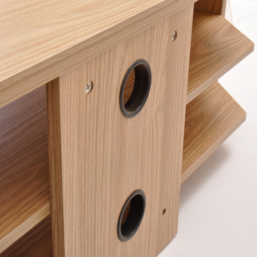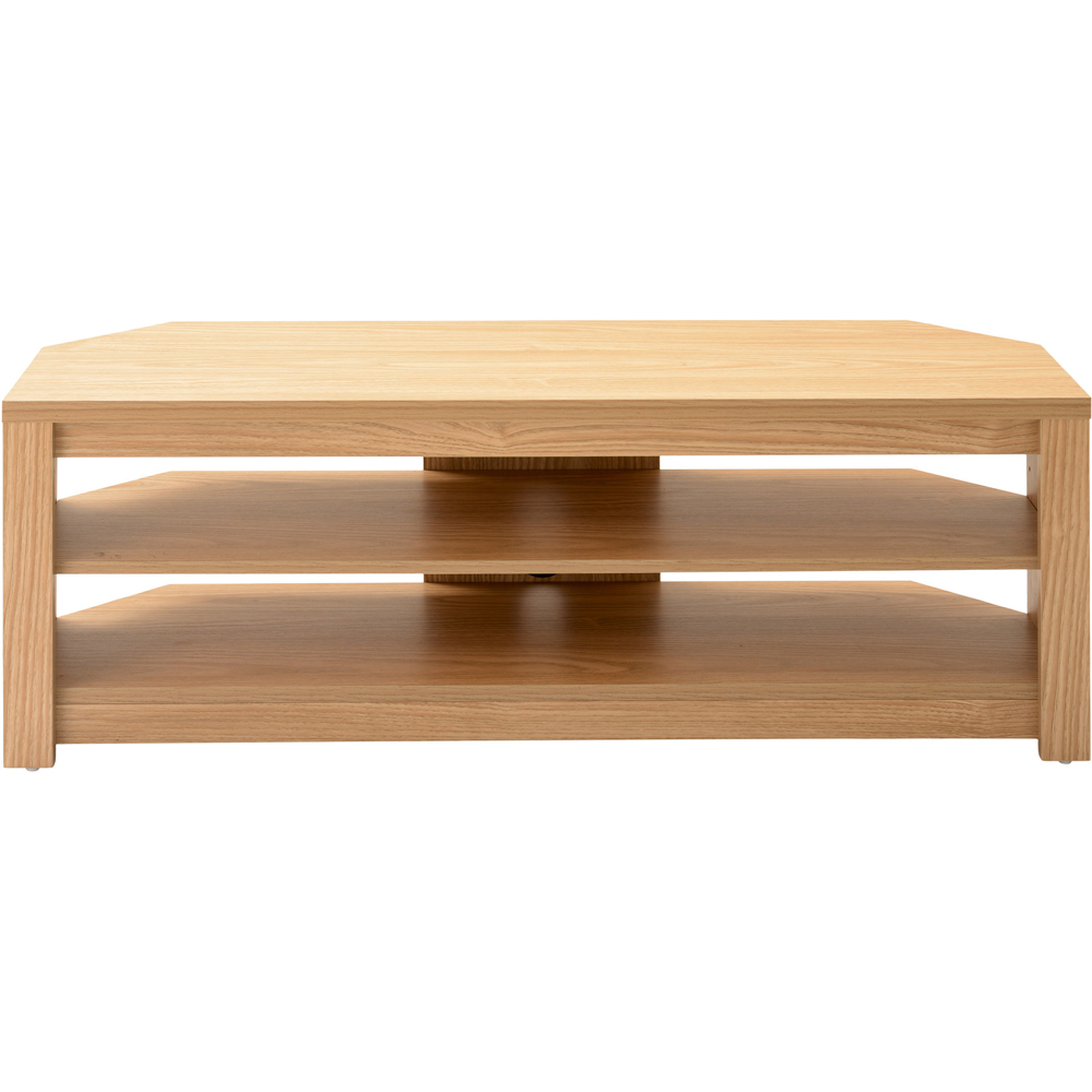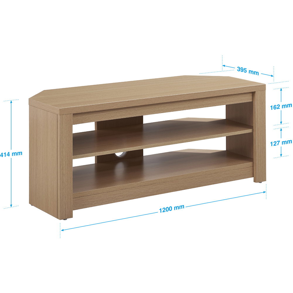 Get your perfect spot for your TV with the TTAP Memphis 2 Shelf Oak TV Unit. This stylish oak wood-effect stand has a smart design with angled corners, so it fits neatly in a corner or against the wall. It has a height-adjustable shelf, giving you plenty of space for your DVD player, satellite box or soundbar. Plus, there is a handy cable management leg at the back to keep messy cables out of sight. Made of solid MDF, it holds up to 45kg on top, 15kg on the upper shelf and 25kg on the lower shelf. Suitable for most TVs up to 65 inches but please check your TV’s pedestal or feet size before buying. Length: 120cm.
