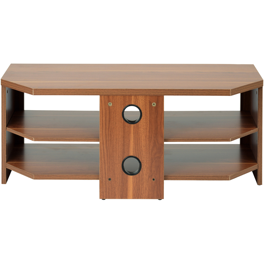 Get your perfect spot for your TV with the TTAP Memphis 2 Shelf Walnut TV Unit. This stylish walnut wood-effect stand has a smart design with angled corners, so it fits neatly in a corner or against the wall. It has a height-adjustable shelf, giving you plenty of space for your DVD player, satellite box or soundbar. Plus, there is a handy cable management leg at the back to keep messy cables out of sight. Made of solid MDF, it holds up to 45kg on top, 15kg on the upper shelf and 25kg on the lower shelf. Suitable for most TVs up to 65 inches but please check your TV’s pedestal or feet size before buying. Length: 120cm.