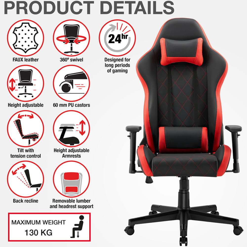 Crafted for the dedicated gamer. The Monaco gaming chair ensures maximum comfort during those extended gaming sessions. Upholstered in hard-wearing, faux leather with striking blue panels and perfectly matched stitching, it also features a removable lumbar support cushion and head pillow. Perfect for those who love to game for hours on end. Designed for full adjustability, it boasts a pneumatic lift seat, five castor wheels and 360-degree swivel for easy movement, adjustable armrests, and a tilt function up to 135 degrees, creating a supremely comfortable gaming chair ideal for marathon play.