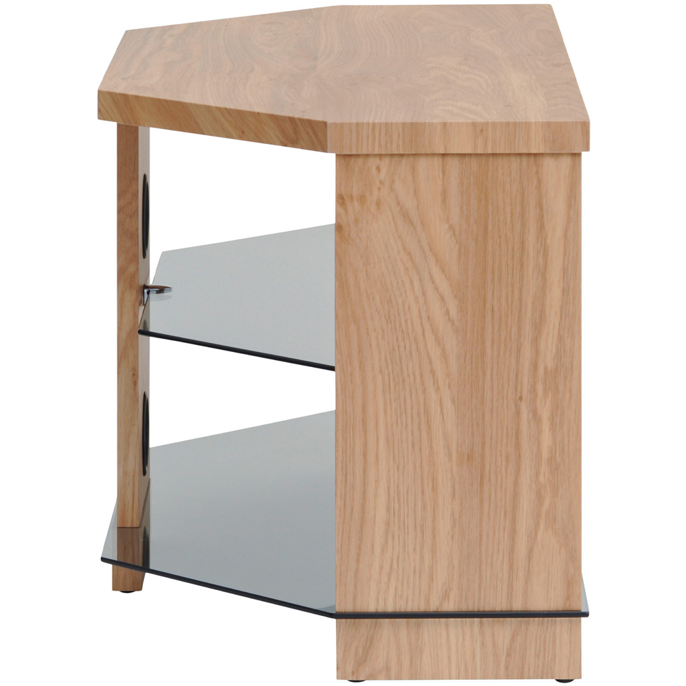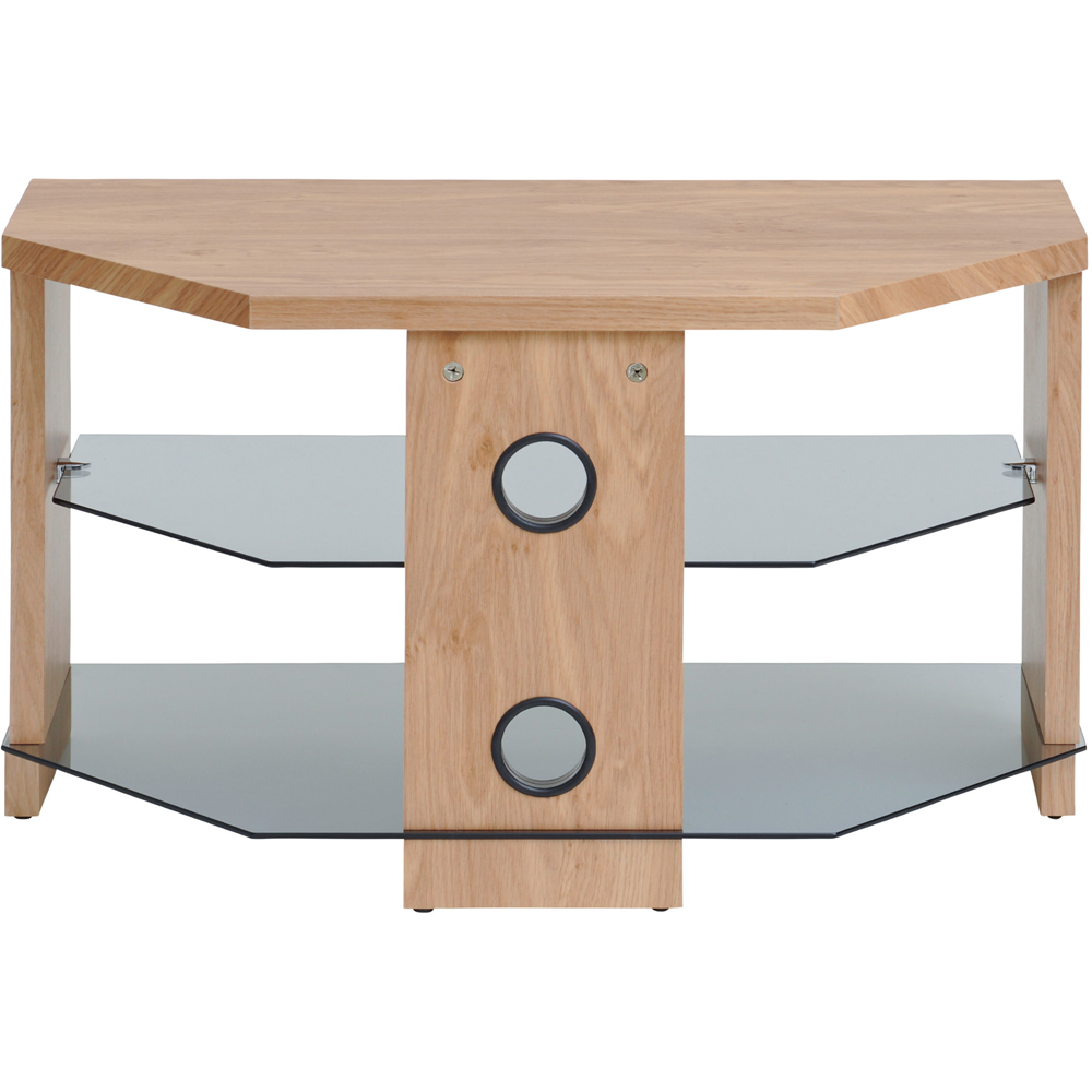 Give your living room a sophisticated look with the TTAP Montreal 2 Shelf Oak TV Unit. With its modern design, wooden construction with a wood grain finish, and tinted glass shelves, it creates a stylish focal point in any space. The chamfered corners make it perfect for placing in a corner, but it looks just as good against a flat wall. The two curved glass shelves offer sufficient space for your DVD player, satellite box, game console and soundbar. The BS6206A toughened glass top and shelves support up to 40kg and 15kg respectively. The built-in cable management system keeps wires neat and out of sight. Suitable for most TVs up to 49 inches, but be sure to check your TV's pedestal or feet before purchase. Length: 800mm.