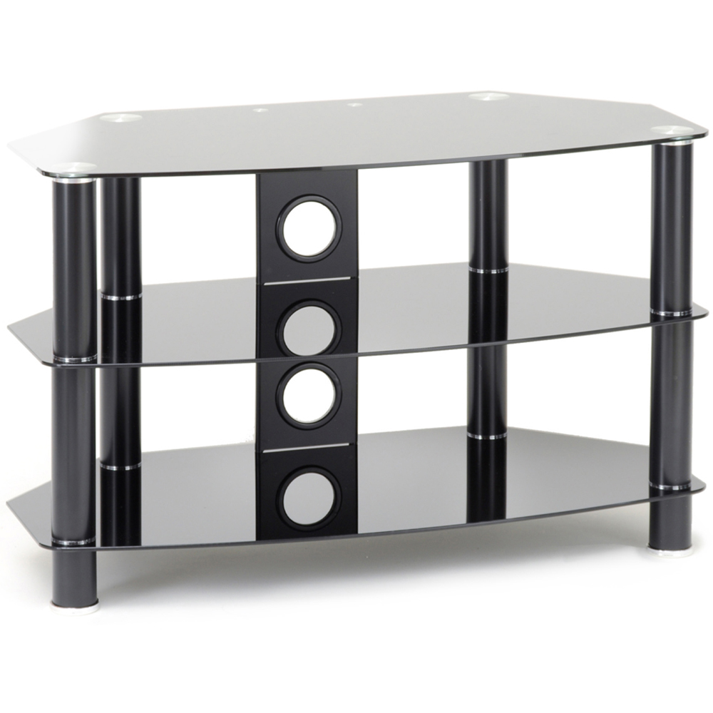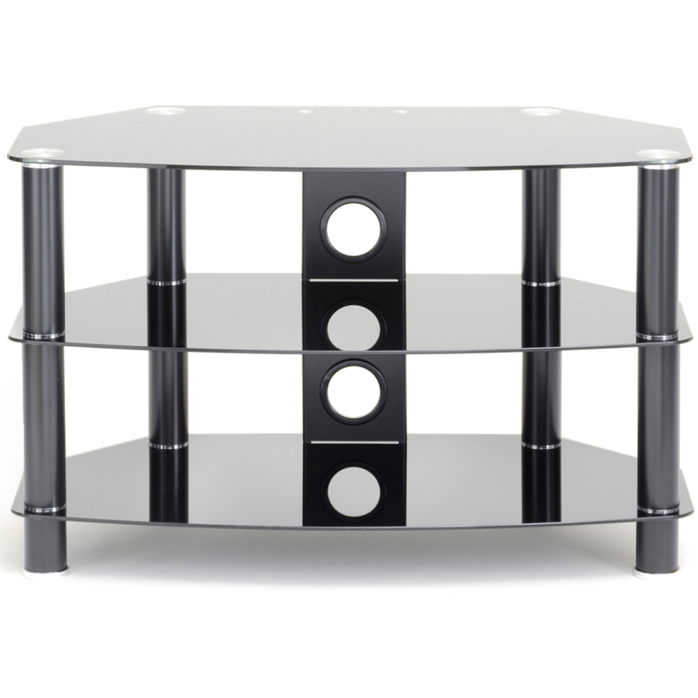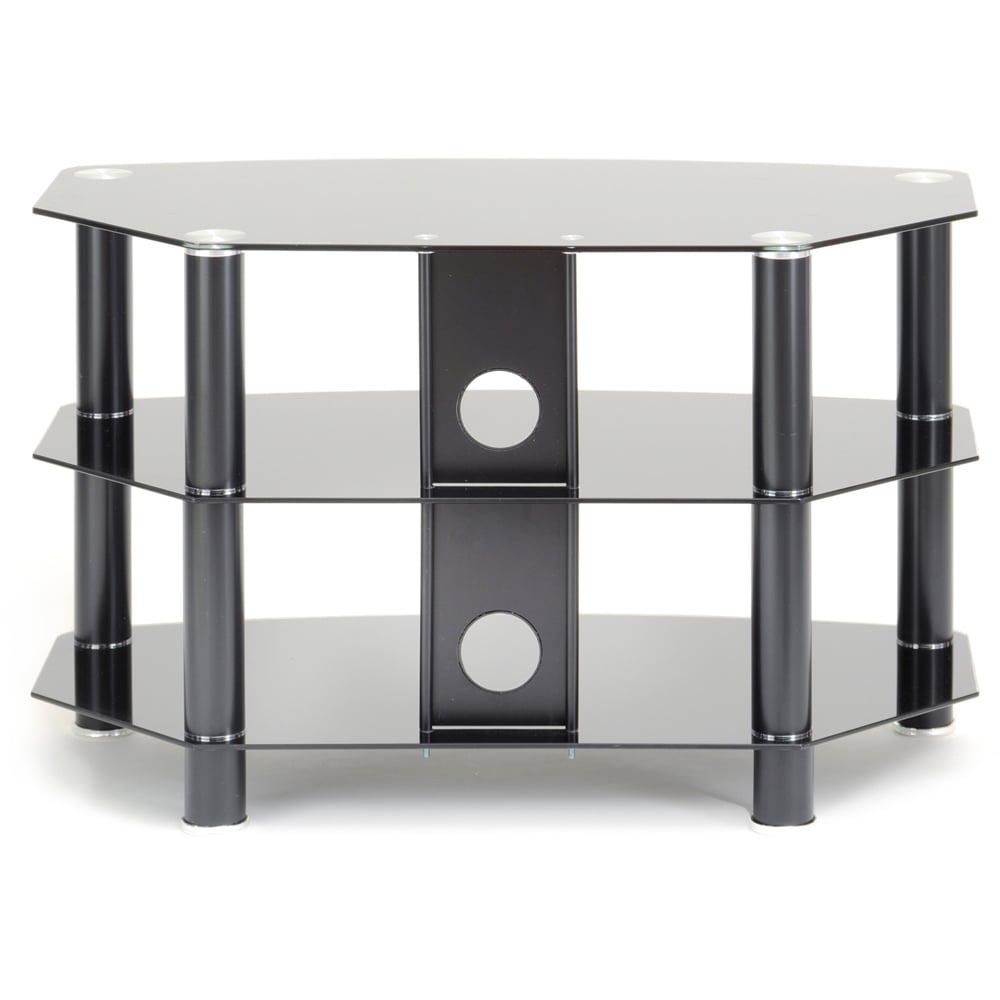 Style your living room with the TTAP Vantage 2 Shelf Black TV Unit. With its minimalist design, black-finished tubular aluminium legs, and black glass shelves, it creates a stylish focal point in any space. The chamfered corners make it perfect for placing in a corner, but it looks just as good against a flat wall. The two curved glass shelves offer sufficient space for your DVD player, satellite box, game console and soundbar. The BS6206A toughened glass top and shelves support up to 70kg and 12kg respectively.  Suitable for most TVs up to 49 inches, but be sure to check your TV's pedestal or feet before purchase. Length: 800mm.