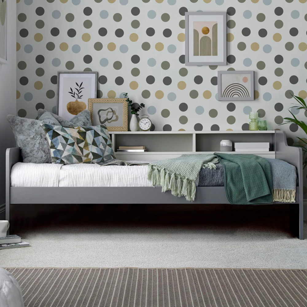 Introduce a touch of simple style to your bedroom or guest room with the Bedmaster Tyler Single Grey Bed. This durable bed frame, constructed from solid pine, features convenient shelves and supportive wooden slats for mattress support, ensuring a comfortable night's sleep. This version does not include a trundle and has a depth of 15.5cm. It is designed to accommodate standard single-size mattresses. Included is a micro-quilted mattress featuring a 13.5-gauge open coil spring system. Delivered flat-packed to the room of your choice, self-assembly is required. For lasting comfort, turn and rotate the mattress regularly. Tested to meet BS7177 standards.