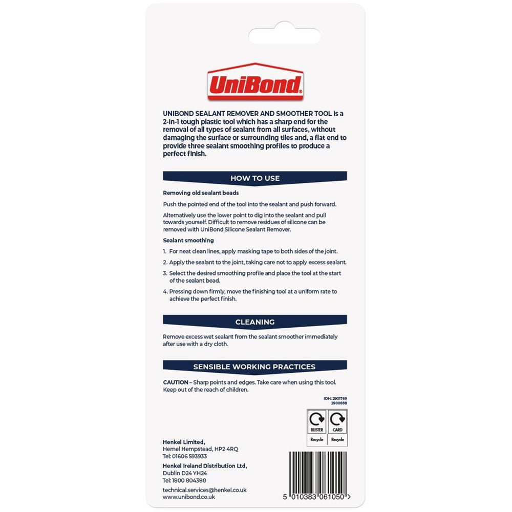 The UniBond 2-in-1 Sealant Tool makes removing and smoothing sealant simple. This durable plastic tool features a sharp end, perfect for removing all types of sealant from any surface without damage to the surface or surrounding tiles. It also has a flat edge designed to smooth sealant, guaranteeing a perfect finish. This sealant remover is tough and built to last, making the job of removing or smoothing sealant quick, easy and fuss-free. The design allows you to remove existing sealant easily without unsightly scratches to tiles or other surfaces.