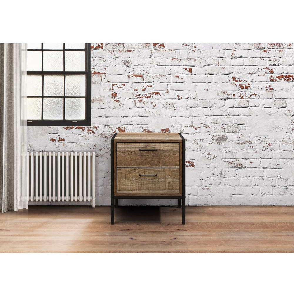 This Urban Brown Bedside Table brings industrial chic to your bedroom with its classic brown finish and durable structure. The smooth tabletop is perfect for displaying items such as an alarm clock, complemented by sleek handles and sturdy feet. Two drawers offer ample storage for bedside essentials. Crafted with a metal frame featuring industrial-effect detailing, this versatile piece complements all types of interior spaces.