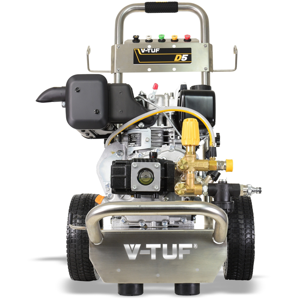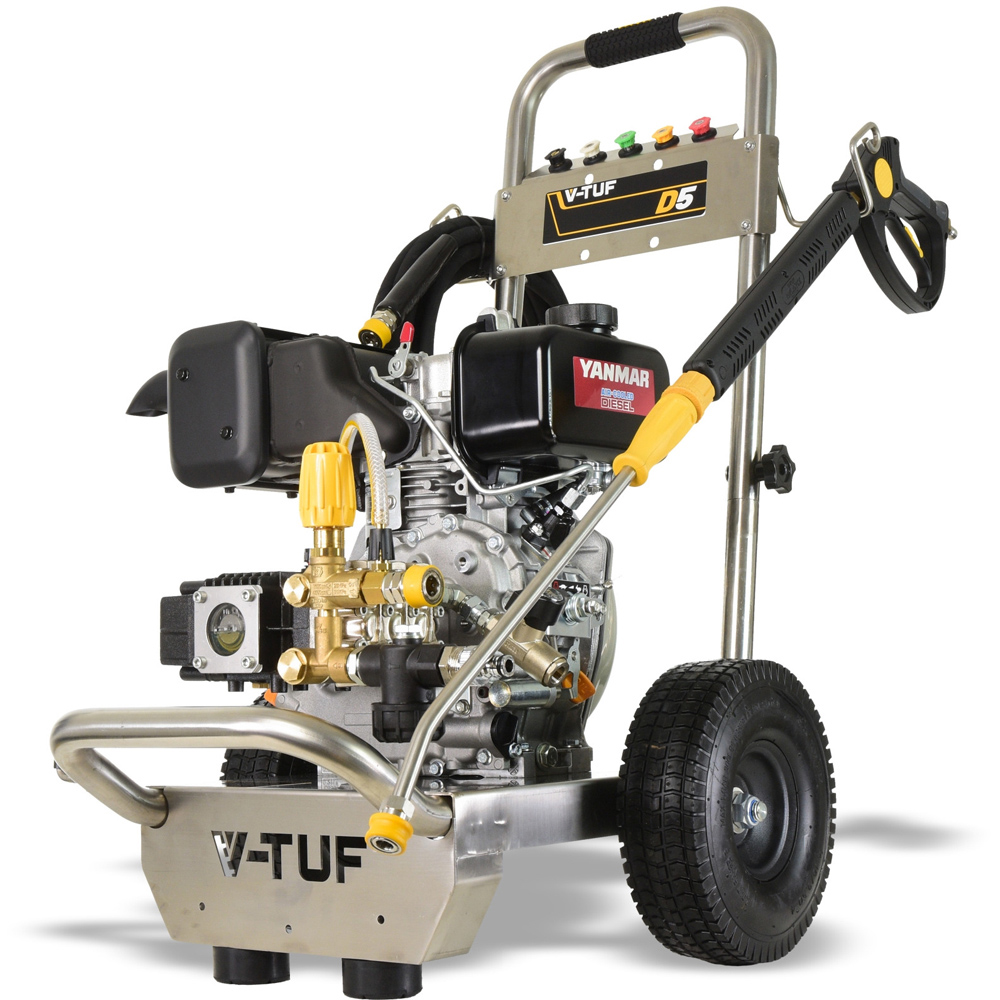 Effortless cleaning power meets robust construction in the VTUFD5-DD13150 5HP pressure washer. This trolley-mounted diesel unit delivers exceptional performance for heavy-duty tasks, boasting a powerful 2200psi (150BAR) output and a generous 13L/MIN flow rate. Its reliable Yanmar engine and pump, lubricated with high-performance V-TUF PRESSURE LUBE PL500, ensure longevity and near-zero friction. The robust chassis, featuring ',stay up', foam walled wheels, provides excellent manoeuvrability, while the ergonomic design promotes comfortable extended use. Reduce your environmental impact with up to 90% lower Greenhouse Gas emissions when using HVO fuel. This pressure washer includes a 10m 3/8 hose, DURAKLIX MSQ and SSQ quick release couplings, spray gun and lance, detergent injection system, and four variations of SSQ power clean jets, including a Turbo Nozzle that doubles cleaning power and triples cleaning speed compared to a standard jet. Built in Britain, this pressure washer is pre-delivery inspected and tested for reliable operation. Simple servicing and adaptation further enhance its practicality. Pull start facility.