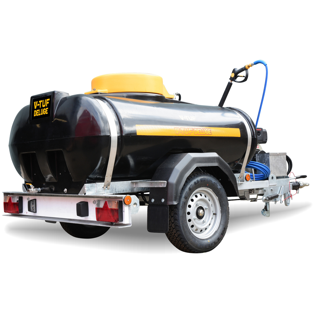 The V-TUF Deluge heavy-duty towable pressure washer tackles tough cleaning jobs with ease. Its powerful 13HP petrol Honda GX390 engine (with electric and recoil start) delivers 15 litres per minute at 275 psi (4000 PSI) pressure. The substantial 1125-litre water tank provides 75 minutes of continuous cleaning. Mounted on a robust, hot-dipped galvanised steel chassis (5mm thick), this unit boasts European whole vehicle type approval for road towing. Features include a durable polyethylene tank with a hinged lockable cover, internal baffle, frost drain, and filler strainer. Transportation is simplified with a telescopic jockey wheel/jack and forklift points. The trailer boasts 2 x 175R13 8-ply tyres with moulded mudguards, a Knott-Avonride 200kg auto-reverse braked coupling (40mm or 50mm ball option available), integrated lance holder with 40-metre hose reel storage, and complete lighting with 13-pin and 7-pin adaptors. A break-away cable is included. The pressure washer itself features a protective frame, accessible service points, detergent/chemical feed line with strainer filter, inlet-line strainer, ignition warning system, a high-quality triple piston gearbox-driven pump, and professional two-wire 40m braided hoses with quick-release couplings. Thermal pump protection and a lance with safety trigger lock are also standard. Dimensions are 3455 x 1550 x 1680mm (L x W x H), unladen weight is 460kg, and maximum laden weight is 1500kg. Fuel tank capacity is 6.1 litres and maximum towing speed is 60 mph. Tyre pressure is 60 psi (4.13 bar). Perfect for hire and rental.