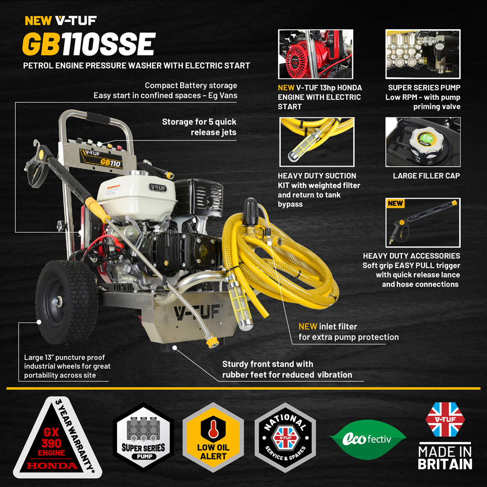 • 13HP Black Edition Honda GX390 V-TUF Petrol Engine - Complies With Euro V Emission Standard 200 Bar