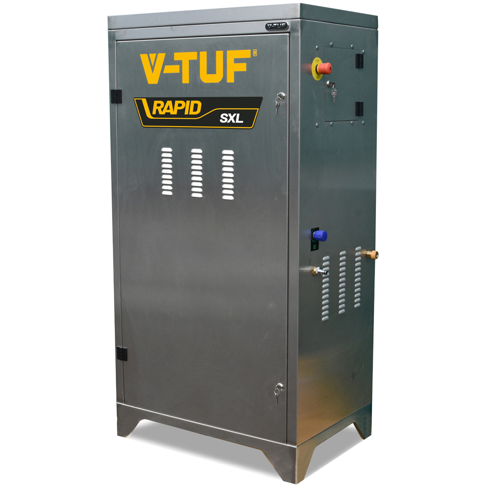 The V-TUF RAPID SXL delivers powerful hot water cleaning performance, ideal for demanding environments. This stainless steel cabinet pressure washer boasts a robust 3000 PSI (200 BAR) output at 15 litres per minute, ensuring efficient cleaning. Designed for durability, its tamper-proof, lockable stainless steel cabinet protects against weather damage and theft, while dual doors allow for easy servicing. Vibration dampening ensures quiet operation, complemented by a key-lockable control panel offering intuitive ON/OFF controls for the machine, hot water, and detergent. A fuel-efficient, clean-burning diesel boiler, coupled with frost protection technology (fireproof cabinet insulation and uniform cabinet heating), ensures reliable performance. Safety features include fire safety shut-off fuel valves and a low water sensor. WRAS BS 1212 compliance and a leak detection monitor provide peace of mind. Servicing is simplified by readily accessible components. Additional features include a 43-litre integral fuel tank, high-pressure chemical delayed total stop auto shut down, and floor mounting bolt holes. This professional-grade hot static pressure washer complies with Flame Failure Control (on 240 and 415-volt models.