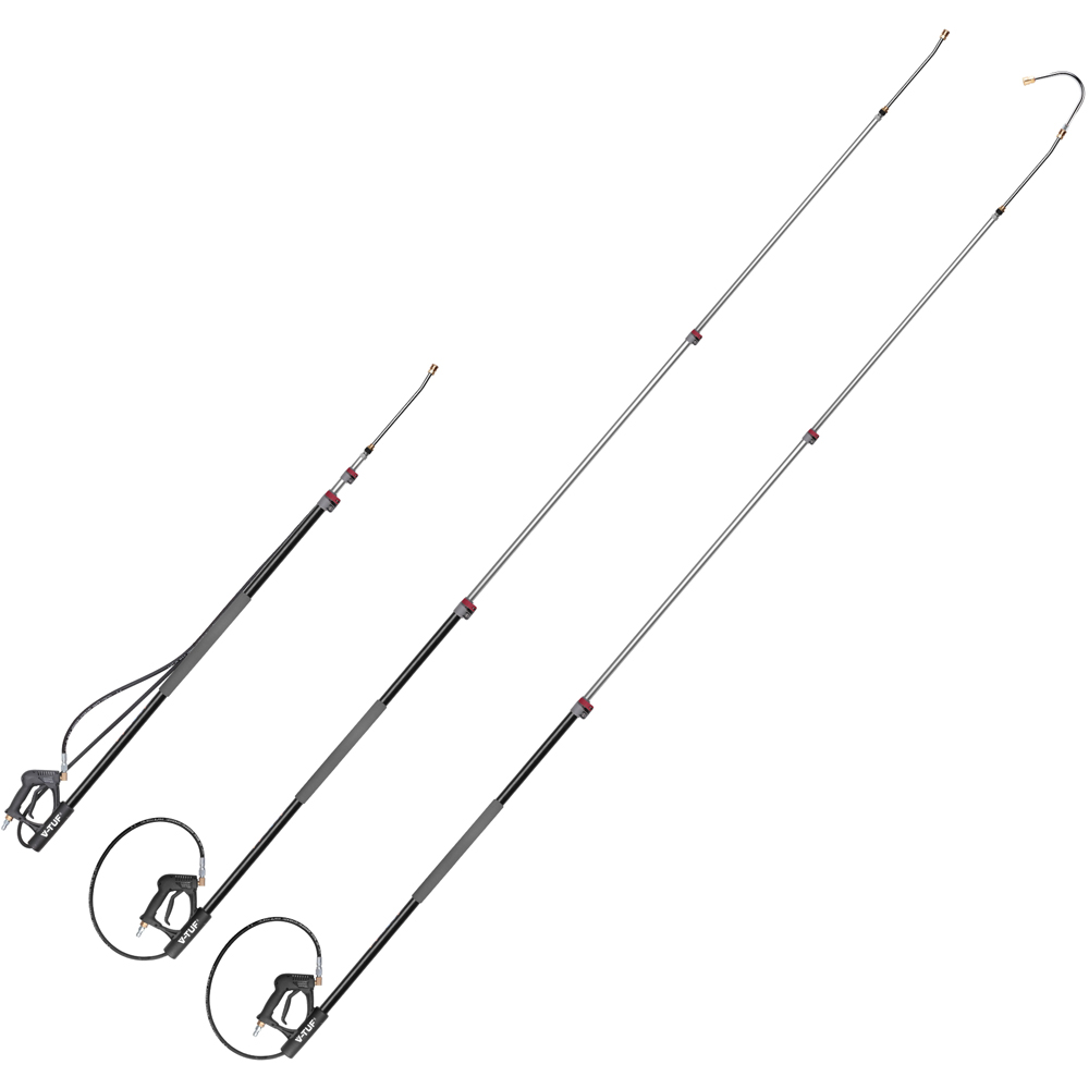 Reach new heights with the V-TUF High Pressure Extendable Telescopic Lance – your safe solution for elevated cleaning. Boasting a robust fibreglass and aluminium construction, this lance handles pressures up to 275 bar and flows up to 30 litres per minute at a maximum temperature of 90°C. It features a detachable cleaning end tube (M22M x SSQ F) and a gutter cleaning U-tube end (also M22M x SSQ F), along with an M22F coupling outlet and a quick-release SSQ type jet connexion. A support belt is included for comfortable operation. The lance also includes a high-pressure gun with 3/8F inlet and M22M &, MSQ male adaptors. Note: A separate adaptor may be required for your high-pressure hose. Ideal for a wide range of applications, from conservatories and orangeries to cladding, gutters, roofs, solar panels, and stone and brickwork. Clean large vehicles such as lorries, coaches, and boats with ease. Expand its capabilities further with compatible V-TUF accessories like surface cleaners, soft wash kits, and turbo nozzles. For tackling mossy roofs, use in conjunction with V-TUF D-GREEN. Please note: Specifications may be subject to change. Images are for illustrative purposes only.
