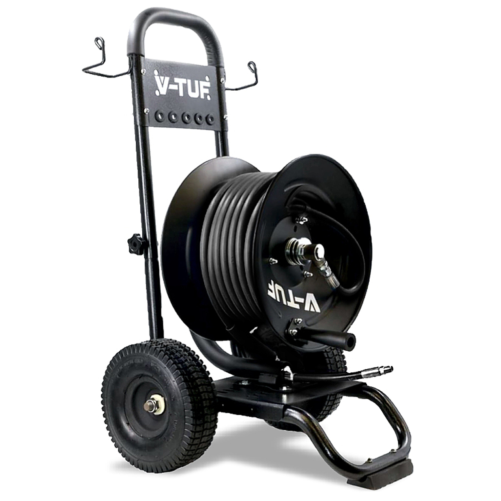Effortlessly manage your high-pressure washing hose with this robust and portable solution. Perfect for professional cleaning and contracting work, this 50-metre, 5/16", (2W), 400-bar, 150°C jet wash hose offers superior durability. Its compact design features two frame options: Frame 2 measures 640mm high, 610mm wide (across wheels), and 450mm long, Frame 1 measures 640mm high, 510mm wide (across wheels), and 450mm long (all measurements exclude the handle). The hose boasts an MSQ male inlet and an MSQ female outlet. Replacement parts include swivel joint (order W5.552 + B5.238) and inlet hose (VTK23801MMN: 1m, 2W, 3/8",, black V-TUF hose with 3/8", male x 3/8", male fittings). Please note: specifications may vary, images are for illustrative purposes only.