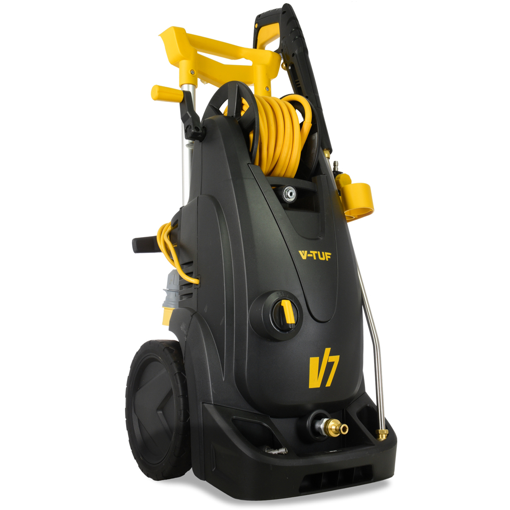 The V-TUF V7 110v pressure washer delivers powerful cleaning performance for a wide range of tasks. Its 150-bar maximum pressure tackles stubborn dirt and grime effortlessly, while the innovative TTS (Total Stop System) conserves energy and ensures consistent operation. The high-visibility 10m hose, housed on an ergonomic reel, and large rear wheels with anti-topple design enhance usability and safety. Onboard storage neatly accommodates professional-grade accessories, including a vario power lance with five quick-release nozzles and a dirt blaster lance, all designed for outstanding cleaning results. A snow foam applicator and bottle are included for efficient detergent application. The brushless motor provides extended lifespan compared to standard domestic models, making this a robust and reliable choice for home, garden, and even construction site use (110V compatible). The telescopic aluminium handle and heavy-duty wheels ensure easy manoeuvrability and storage. Optional cleaning brushes (Order Code: H2.021SSQ or H2.022SSQ) and a patio cleaner attachment (Order Code: VXB or VXB-SSQM) are available separately. The yellow hose and cable enhance safety by reducing trip hazards.