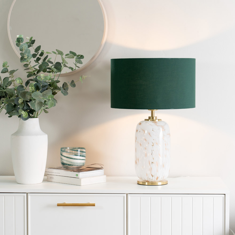 The India White Confetti Glass LED Table Lamp brings a touch of fun and sophistication to your home. Its classic silhouette is playfully updated with a confetti glass body and a stylish green shade. Easy to maintain with a simple dry wipe clean. Enjoy peace of mind with the included 12-month warranty.