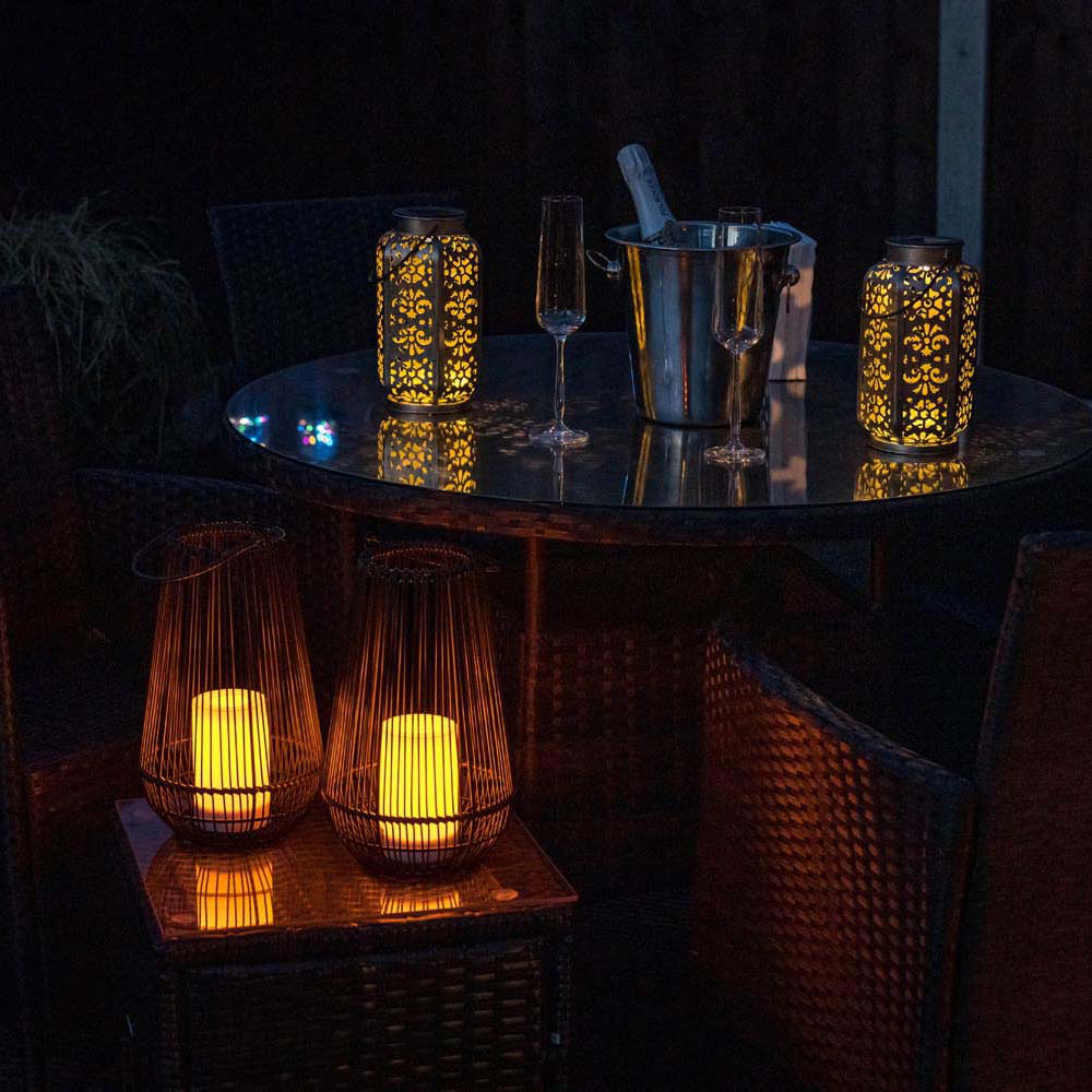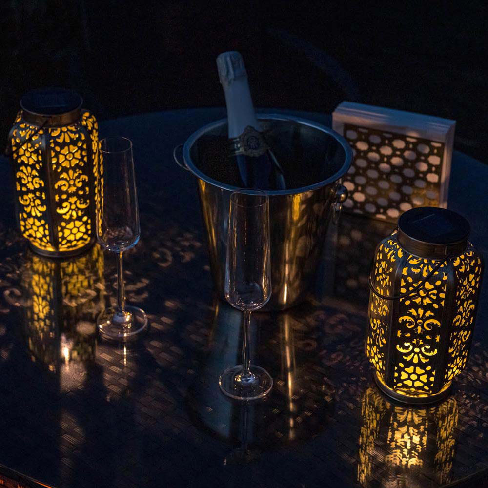 Enhance your outdoor space with the Solar Antique Brass Moroccan Style Lantern. This eco-friendly solar-powered lantern, with its antique brass finish and Moroccan design base, creates a warm and inviting ambiance. Ideal for terraces, balconies, or as table decorations, it's perfect for summer evenings and brightening dark winter nights. Simply place it in direct sunlight during the day, and enjoy its soft glow as darkness falls. Transform your garden into a stunning and elegant retreat.