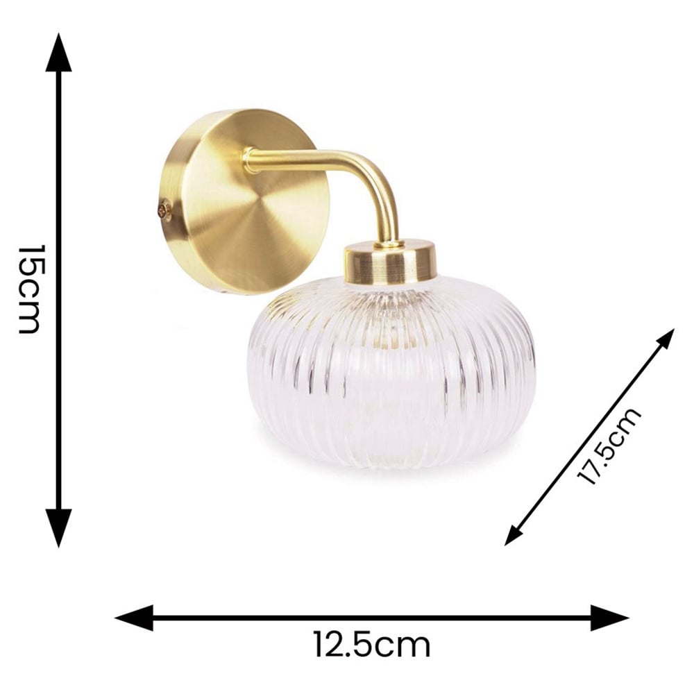Add a touch of modern glamour to your living room, bedroom, bathroom, or reading nook with this stunning pair of wall lights. The statement gold metal finish and clear, ribbed glass shade create a warm, inviting glow. The ribbed glass diffuses the light softly for a cosy ambiance, enhancing the stylish design. Dimensions: H15 x W12.5 x D17.5cm.