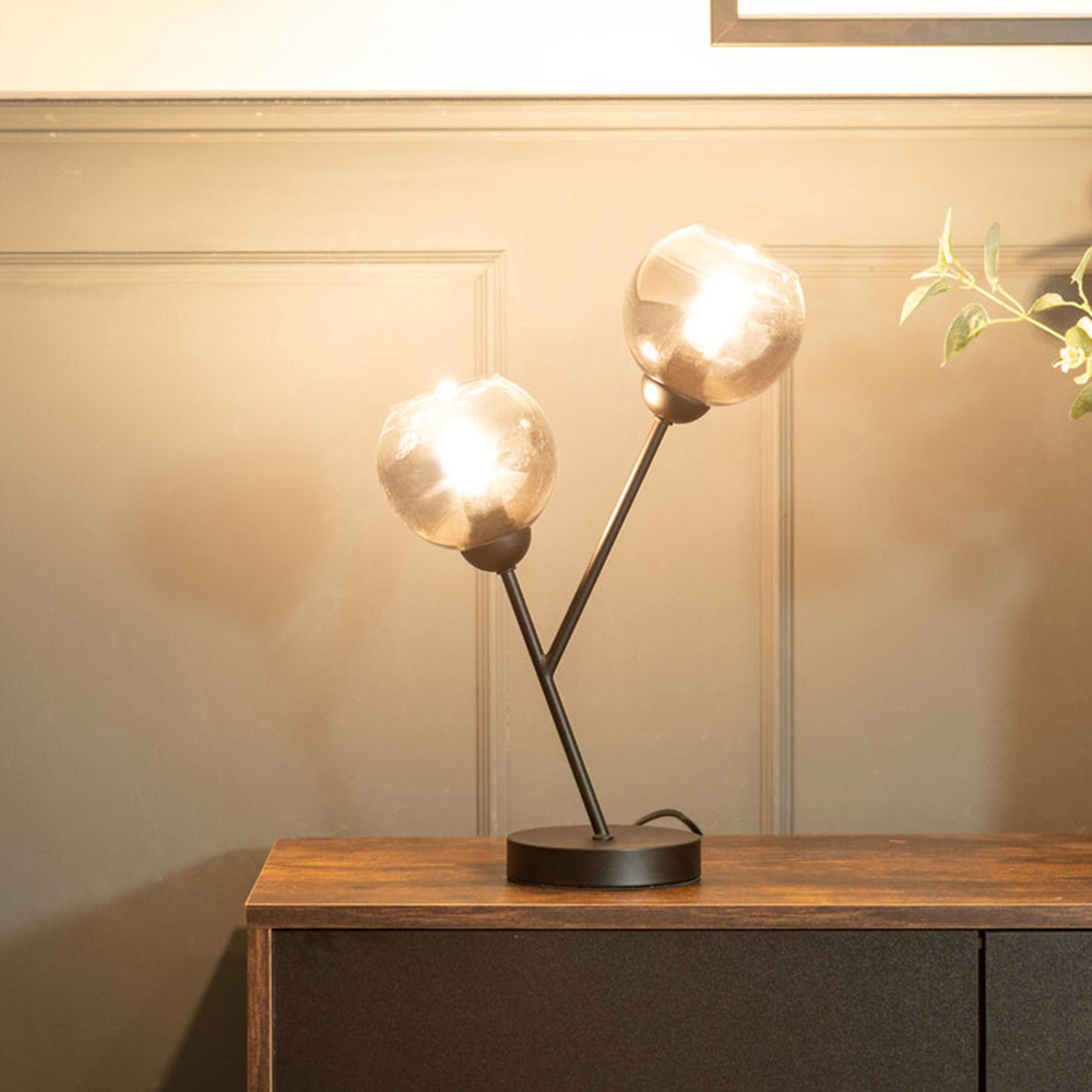 This stylish black metal table lamp adds industrial-chic appeal to any room. Its two-way design, with smoked glass lampshades, offers a unique aesthetic. Conveniently controlled by an in-line rocker switch, it effortlessly illuminates your space. A minimalist statement piece, perfect for modern living.