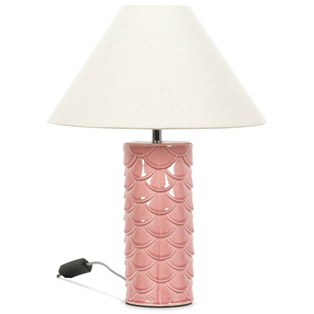 Illuminate your home with this captivating table lamp, showcasing a unique 3D shell design. Its glazed ceramic base, in a vibrant coral finish with a scalloped pattern, offers a striking focal point. A natural tapered fabric shade complements the base, diffusing light for a soft and inviting ambiance. This elegant lamp, with its mermaid-inspired aesthetic, adds a touch of whimsical charm. Conveniently controlled by an in-line rocker switch, it effortlessly brightens your room.