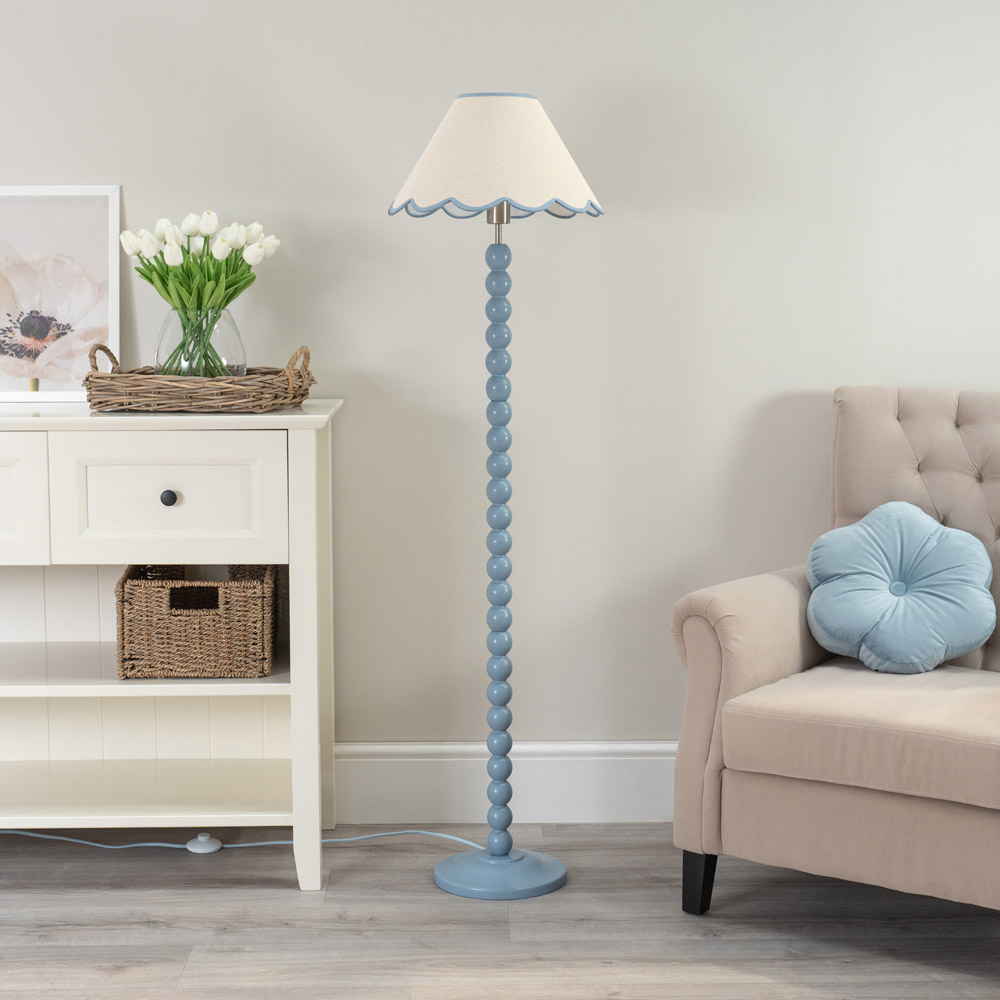 Illuminate your space with the ValueLights Bobbins Powder Blue LED Floor Lamp. Featuring a stylish blue trim scallop shade, this lamp complements any room, adding a touch of elegance to nurseries and dining rooms alike. Simply wipe clean with a dry cloth for easy maintenance. Enjoy the peace of mind that comes with our 12-month warranty.