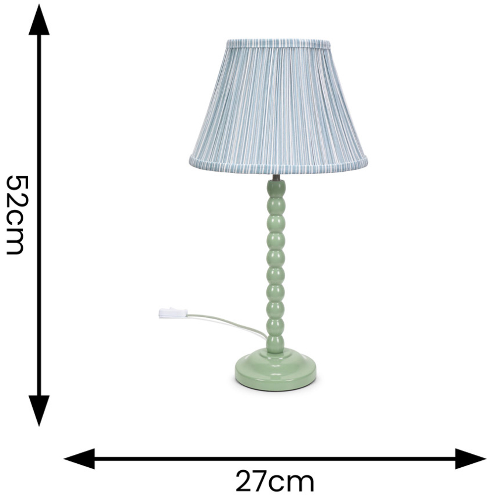 Illuminate your home with the Bobbins Sage Green LED table lamp. Featuring a stylish blue stripe fabric shade, this versatile lamp complements any room, from the nursery to the dining room. Its elegant design adds a touch of charm to your décor. For cleaning, simply wipe with a dry cloth. A 12-month warranty is included.